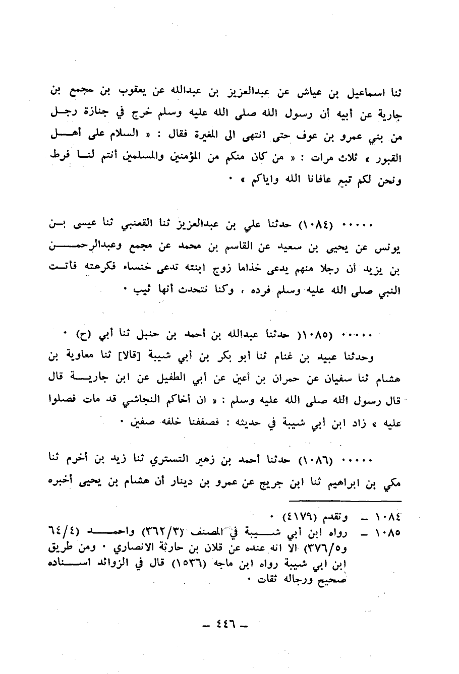 1085 - حَدَّثَنَا عَبْدُ اللهِ بْنُ أَحْمَدَ بْنِ حَنْبَلٍ، ثنا أَبِي، ح وَحَدَّثَنَا عُبَيْدُ بْنُ غَنَّامٍ، ثنا أَبُو بَكْرِ بْنُ أَبِي شَيْبَةَ، قَالَا: ثنا مُعَاوِيَةُ بْنُ هِشَامٍ، ثنا سُفْيَانُ، عَنْ حُمْرَانَ بْنِ أَعْيَنَ، عَنْ أَبِي الطُّفَيْلِ، عَنِ ابْنِ جَارِيَةَ، قَالَ: قَالَ رَسُولُ اللهِ صَلَّى اللهُ عَلَيْهِ وَسَلَّمَ: «إِنَّ §أَخَاكُمُ النَّجَاشِيَّ قَدْ مَاتَ فَصَلُّوا عَلَيْهِ» . زَادَ ابْنُ أَبِي شَيْبَةَ فِي حَدِيثِهِ: «فَصَفَفَنَا خَلْفَهُ صَفَّيْنِ»