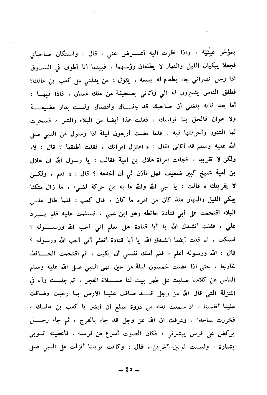 قَالَ : وَاسْتَكَانَ صَاحِبَايَ فَجَعَلاَ يَبْكِيَانِ اللَّيْلَ وَالنَّهَارَ لاَ يُطْلِعَانِ رُؤُوسَهُمَا ، فَبَيْنَمَا أَنَا أَطُوفُ فِي السُّوقِ إِذَا رَجُلٌ نَصْرَانِيٌّ جَاءَ بِطَعَامٍ لَهُ يَبِيعُهُ يَقُولُ : مَنْ يَدُلُّنِي عَلَى كَعْبِ بْنِ مَالِكٍ ؟ فَطَفِقَ النَّاسُ يُشِيرُونَ لَهُ إِلَيَّ ، وَأَتَانِي بِصَحِيفَةٍ مِنْ مَلِكِ غَسَّانَ ، فَإِذَا فِيهَا : أَمَّا بَعْدُ ، فَإِنَّهُ بَلَغَنِي أَنَّ صَاحِبَكَ قَدْ جَفَاكَ ، وَأَقْصَاكَ ، وَلَسْتَ بِدَارِ مَضْيَعَةٍ ، وَلاَ هَوَانٍ ، فَالْحَقْ بِنَا نُوَاسِكَ ، فَقُلْتُ : هَذَا أَيْضًا مِنَ الْبَلاَءِ ، وَالشَّرِّ فَسَجَرْتُ لَهَا التَّنُّورَ وَأَحْرَقْتُهَا فيهِ ، فَلَمَّا مَضَتْ أَرْبَعُونَ لَيْلَةً إِذَا رَسُولٌ مِنَ النَّبِيِّ صَلَّى اللَّهُ عَلَيْهِ وَسَلَّمَ قَدْ أَتَانِي ، فَقَالَ : اعْتَزَلِ امْرَأَتَكَ ، فَقُلْتُ : أُطَلِّقُهَا ؟ قَالَ : لاَ ، وَلَكِنْ لاَ تَقْرَبْهَا ، فَجَاءَتِ امْرَأَةُ هِلاَلِ بْنِ أُمَيَّةَ ، فَقَالَتْ : يَا رَسُولَ اللهِ إِنَّ هِلاَلَ بْنَ أُمَيَّةَ شَيْخٌ كَبِيرٌ ضَعِيفٌ ، فَهَلْ تَأْذَنُ لِي أَنْ أَخْدُمَهُ ؟ قَالَ : نَعَمْ ، وَلَكِنْ لاَ يَقْرَبَنَّكِ ، قَالَتْ : يَا نَبِيَّ اللهِ وَاللَّهِ مَا بِهِ مِنْ حَرَكَةٍ لِشَيْءٍ ، مَا زَالَ مُتَّكِئًا يَبْكِي اللَّيْلَ وَالنَّهَارَ مُنْذُ كَانَ مِنْ أَمْرِهِ مَا كَانَ ، قَالَ كَعْبٌ : فَلَمَّا طَالَ عَلِيَّ الْبَلاَءُ اقْتَحَمْتُ عَلَى أَبِي قَتَادَةَ حَائِطَهُ ، وَهُوَ ابْنُ عَمِّي ، فَسَلَّمْتُ عَلَيْهِ ، فَلَمْ يَرُدَّ عَلِيَّ ، فَقُلْتُ : أَنْشُدُكَ اللَّهَ يَا أَبَا قَتَادَةَ هَلْ تَعْلَمُ أَنِّي أُحِبُّ اللَّهَ وَرَسُولَهُ ؟ فَسَكَتَ ، ثُمَّ قُلْتُ أَيْضًا : أَنْشُدُكَ اللَّهَ يَا أَبَا قَتَادَةَ أَتَعْلَمُ أَنِّي أُحِبُّ اللَّهَ وَرَسُولَهُ ؟ فَسَكَتَ ، ثُمَّ قُلْتُ : أَنْشُدُكَ اللَّهَ يَا أَبَا قَتَادَةَ أَتَعْلَمُ أَنِّي أُحِبُّ اللَّهَ وَرَسُولَهُ ؟ قَالَ : اللَّهُ وَرَسُولُهُ أَعْلَمُ ، فَلَمْ أَمْلِكْ نَفْسِي أَنْ بَكَيْتُ ، ثُمَّ اقْتَحَمْتُ الْحَائِطَ خَارِجًا حَتَّى إِذَا مَضَتْ خَمْسُونَ لَيْلَةً مِنْ حِينِ نَهَى النَّبِيُّ صَلَّى اللَّهُ عَلَيْهِ وَسَلَّمَ النَّاسَ عَنْ كَلاَمِنَا ، صَلَّيْتُ عَلَى ظَهْرِ بَيْتٍ لَنَا صَلاَةَ الْفَجْرِ ، ثُمُّ جَلَسْتُ وَأَنَا فِي الْمَنْزِلَةِ الَّتِي قَالَ اللَّهُ عَزَّ وَجَلَّ : قَدْ ضَاقَتْ عَلَيْنَا الأَرْضُ بِمَا رَحُبَتْ وَضَاقَتْ عَلَيْنَا أَنْفُسُنَا ،