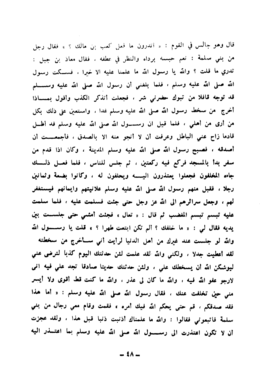 وَجَعَلْتُ إِذَا خَرَجْتُ فِي النَّاسِ بَعْدَ خُرُوجِ رَسُولِ اللهِ صَلَّى اللَّهُ عَلَيْهِ وَسَلَّمَ يَحْزِنُنِي أَنْ لاَ أَرَى إِلاَّ رَجُلاً مَغْمُوصًا عَلَيْهِ فِي النِّفَاقِ ، أَوْ رَجُلاً مِمَّنْ عُذِّرَ أَنَّهُ فِي الضُّعَفَاءِ ، وَلَمْ يَذْكُرْنِي رَسُولُ اللهِ صَلَّى اللَّهُ عَلَيْهِ وَسَلَّمَ حَتَّى بَلَغَ تَبُوكًا ، قَالَ ، وَهُوَ جَالِسٌ فِي الْقَوْمِ : أَتَدْرُونَ مَا فَعَلَ كَعْبُ بْنُ مَالِكٍ ؟ فَقَالَ رَجُلٌ مِنْ بَنِي سَلِمَةَ : نَعَمْ ، حَبَسَهُ بُرْدَاهُ وَالنَّظَرُ فِي عِطْفِهِ ، فَقَالَ مُعَاذُ بْنُ جَبَلٍ : تَدْرِي مَا قُلْتَ ؟ وَاللَّهِ يَا رَسُولَ اللهِ مَا عَلِمْنَا عَلَيْهِ إِلاَّ خَيْرًا . فَسَكَتَ رَسُولُ اللهِ صَلَّى اللَّهُ عَلَيْهِ وَسَلَّمَ ، فَلَمَّا بَلَغَنِي أَنَّ رَسُولَ اللهِ صَلَّى اللَّهُ عَلَيْهِ وَسَلَّمَ قَدْ تَوَجَّهَ قَافِلاً مِنْ تَبُوكٍ حَضَرَنِي شَرٌّ فَجَعَلْتُ أَتَذَكَّرُ الْكَذِبَ وَأَقُولُ : بِمَاذَا أَخْرُجُ مِنْ سَخَطِ رَسُولِ اللهِ صَلَّى اللَّهُ عَلَيْهِ وَسَلَّمَ غَدًا ؟ وَأَسْتَعِينُ عَلَى ذَلِكَ بِكُلِّ مَنْ أَرَى مِنْ أَهْلِي ، فَلَمَّا قِيلَ إِنَّ رَسُولَ اللهِ صَلَّى اللَّهُ عَلَيْهِ وَسَلَّمَ قَدْ أَظَلَّ قَادِمًا زَاحَ عَنِّي الْبَاطِلُ ، وَعَرَفْتُ أَنْ لاَ أَنْجُوَ مِنْهُ إِلاَّ بِالصِّدْقِ ، فَأَجْمَعْتُ أَنْ أَصْدُقَهُ ، فَصَبَّحَ رَسُولُ اللهِ صَلَّى اللَّهُ عَلَيْهِ وَسَلَّمَ الْمَدِينَةَ ، وَكَانَ إِذَا قَدِمَ مِنْ سَفَرٍ بَدَأَ بِالْمَسْجِدِ فَرَكَعَ فِيهِ رَكْعَتَيْنِ ، ثُمَّ جَلَسَ لِلنَّاسِ ، فَلَمَّا فَعَلَ ذَلِكَ جَاءَهُ الْمُخَلَّفُونَ فَجَعَلُوا يَعْتَذِرُونَ إِلَيْهِ وَيَحْلِفُونَ لَهُ ، وَكَانُوا بِضْعَةً وَثَمَانِينَ رَجُلاً ، فَقَبِلَ مِنْهُمْ رَسُولُ اللهِ صَلَّى اللَّهُ عَلَيْهِ وَسَلَّمَ عَلاَنِيَتَهُمْ وَإِيمَانَهُمْ ، فَيَسْتَغْفِرُ لَهُمْ ، وَجَعَلَ سَرَائِرَهُمْ إِلَى اللهِ عَزَّ وَجَلَّ ، حَتَّى جِئْتُ فَسَلَّمْتُ عَلَيْهِ ، فَلَمَّا سَلَّمْتُ عَلَيْهِ تَبَسَّمَ تَبَسُّمَ الْمُغْضَبِ ، ثُمَّ قَالَ : تَعَالَ ، فَجِئْتُ أَمْشِي حَتَّى جَلَسْتُ بَيْنَ يَدَيْهِ ، فَقَالَ لِي : مَا خَلَفَكَ ؟ أَلَمْ تَكُنِ ابْتَعْتَ ظَهْرًا ؟ قُلْتُ : يَا رَسُولَ اللهِ وَاللَّهِ لَوْ جَلَسْتُ عِنْدَ غَيْرِكِ مِنْ أَهْلِ الدُّنْيَا لَرَأَيْتُ أَنِّي سَأَخْرُجُ مِنْ سَخْطَتِهِ ، لَقَدْ أُعْطِيتُ جَدَلاً ، وَلَكِنِّي وَاللَّهِ لَقَدْ عَلِمْتُ لَئِنْ حَدَّثْتُكَ الْيَوْمَ كَذِبًا لِتَرْضَى عَنِّي لَيُوشِكَنَّ اللَّهُ أَنْ يُسْخِطَكَ عَلَيَّ ، وَلَئِنْ حَدَّثْتُكَ حَدِيثًا صَادِقًا تَجِدُ عَلِيَّ فِيهِ إِنِّي لأَرْجُو عَفْوَ اللهِ فِيهِ ، وَاللَّهِ مَا كَانَ لِي عُذْرٌ ، وَاللَّهِ مَا كُنْتُ قَطُّ أَقْوَى وَلاَ أَيْسَرَ مِنِّي حِينَ تَخَلَّفْتُ عَنْكَ ، فَقَالَ رَسُولُ اللهِ صَلَّى اللَّهُ عَلَيْهِ وَسَلَّمَ : أَمَّا هَذَا فَقَدْ صَدَقَكُمْ ، قُمْ حَتَّى يَحْكُمَ اللَّهُ فِيكَ أَمَرَهُ ،