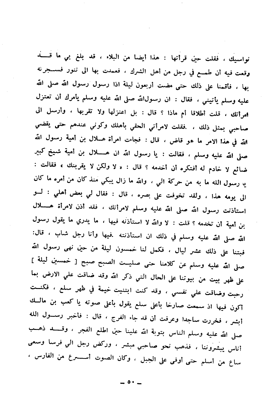 فَجَعَلَ النَّاسُ يُشِيرُونَ إِلَيَّ ، حَتَّى جَاءَنِي فَدَفَعَ إِلَيَّ كِتَابًا مِنْ مَلَكِ غَسَّانَ ، وَكَتَبَ كِتَابًا فِي سَرَقَةٍ مِنْ حَرِيرٍ ، فَإِذَا فِيهِ : أَمَّا بَعْدُ ، فَإِنَّهُ قَدْ بَلَغَنَا أَنَّ صَاحِبَكَ قَدْ جَفَاكَ وَلَمْ يَجْعَلْكَ اللَّهُ بَدَارَ هَوَانٍ ، وَلاَ مَضْيَعَةً ، فَالْحَقْ بِنَا نُوَاسِكَ ، فَقُلْتُ حِينَ قَرَأْتُهَا : هَذَا أَيْضًا مِنَ الْبَلاَءِ ، قَدْ بَلَغَ بِي مَا قَدْ وَقَعَتُ فِيهِ أَنْ طَمَعَ فِيَّ رَجُلٌ مِنْ أَهْلِ الشِّرْكِ ، فَعَمَدْتُ بِهَا إِلَى تَنُّورٍ فَسَجَرْتُهُ بِهَا ، فَأَقَمْنَا عَلَى ذَلِكَ حَتَّى مَضَتْ أَرْبَعُونَ لَيْلَةً ، إِذَا رَسُولُ رَسُولِ اللهِ صَلَّى اللَّهُ عَلَيْهِ وَسَلَّمَ يَأْتِينِي ، فَقَالَ : إِنَّ رَسُولَ اللهِ صَلَّى اللَّهُ عَلَيْهِ وَسَلَّمَ يَأْمُرُكَ أَنْ تَعْتَزِلَ امْرَأَتَكَ ، قُلْتُ : أَطَلاَقًا أَمْ مَاذَا ؟ قَالَ : بَلِ اعْتَزِلْهَا وَلاَ تَقْرَبْهَا ، وَأَرْسَلَ إِلَى صَاحِبَيَّ بِمِثْلِ ذَلِكَ ، فَقُلْتُ لاِمْرَأَتِي : الْحَقِي بِأَهْلِكِ ، وَكُونِي عِنْدَهُمْ حَتَّى يَقْضِيَ اللَّهُ فِي هَذَا الأَمْرِ مَا هُوَ قَاضٍ ، قَالَ : فَجَاءَتِ امْرَأَةُ هِلاَلِ بْنِ أُمَيَّةَ رَسُولَ اللهِ صَلَّى اللَّهُ عَلَيْهِ وَسَلَّمَ ، فَقَالَتْ : يَا رَسُولَ اللهِ إِنَّ هِلاَلَ بْنَ أُمَيَّةَ شَيْخٌ كَبِيرٌ ضَائِعٌ لاَ خَادِمَ لَهُ ، أَفَتَكْرَهُ أَنْ أَخْدُمَهُ ؟ قَالَ : لاَ ، وَلَكِنْ لاَ يَقْرَبَنَّكِ ، فَقَالَتْ : يَا رَسُولَ اللهِ مَا بِهِ مِنْ حَرَكَةٍ إِلَيَّ ، وَاللَّهِ مَا زَالَ يَبْكِي مُنْذُ كَانَ أَمْرُهُ مَا كَانَ إِلَى يَوْمِهِ هَذَا ، وَلَقَدْ تَخَوَّفْتُ عَلَى بَصَرَهِ ، قَالَ : فَقَالَ لِي بَعْضُ أَهْلِي : لَوِ اسْتَأْذَنْتَ رَسُولَ اللهِ صَلَّى اللَّهُ عَلَيْهِ وَسَلَّمَ لاِمْرَأَتِكَ ، فَقَدْ أَذِنَ لاِمْرَأَةِ هِلاَلِ بْنِ أُمَيَّةَ أَنْ تَخْدُمَهُ ، قُلْتُ : لاَ وَاللَّهِ ، لاَ أَسْتَأْذِنَهُ فِيهَا ، مَا يُدْرَى مَا يَقُولُ رَسُولُ اللهِ صَلَّى اللَّهُ عَلَيْهِ وَسَلَّمَ فِي ذَلِكَ إِنِ اسْتَأْذَنْتُهُ فِيهَا وَأَنَا رَجُلٌ شَابٌّ ، قَالَ : فَبِتْنَا عَلَى ذَلِكَ عَشْرَ لَيَالٍ ، فَكَمُلَ لَنَا خَمْسُونَ لَيْلَةً مِنْ حِينِ نَهَى رَسُولُ اللهِ صَلَّى اللَّهُ عَلَيْهِ وَسَلَّمَ عَنْ كَلاَمِنَا ، حَتَّى صَلَّيْتُ الصُّبْحَ صُبْحَ خَمْسِينَ لَيْلَةٍ عَلَى ظَهْرِ بَيْتٍ مِنْ بُيُوتِنَا عَلَى الْحَالِ الَّتِي ذَكَرَ اللَّهُ ، وَقَدْ ضَاقَتْ عَلِيَّ الأَرْضُ بِمَا رَحُبَتْ ، وَضَاقَتْ عَلِيَّ نَفْسِي ، وَقَدْ كُنْتُ ابْتَنَيْتُ خَيْمَةً فِي ظَهْرِ سَلْعٍ ، فَكُنْتُ أَكُونُ فِيهَا ، إِذْ سَمِعْتُ صَارِخًا بِأَعْلَى سَلْعٍ ، يَقُولُ بِأَعْلَى صَوْتِهِ : يَا كَعْبُ بْنُ مَالِكٍ أَبْشِرْ ، فَخَرَرْتُ سَاجِدًا ، وَعَرَفْتُ أَنْ قَدْ جَاءَ الْفَرَجُ ،