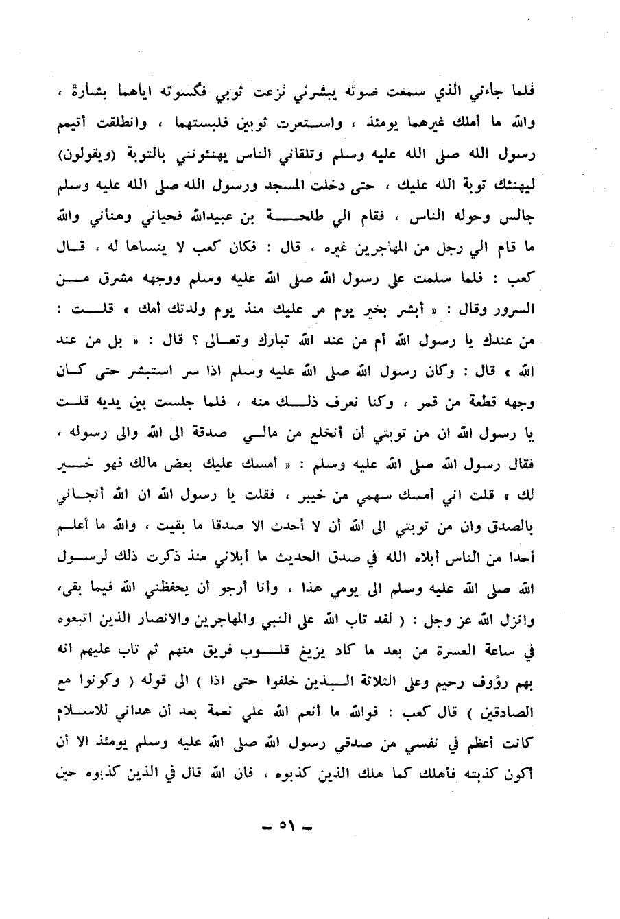 قَالَ : فَأَخْبَرَ رَسُولُ اللهِ صَلَّى اللَّهُ عَلَيْهِ وَسَلَّمَ النَّاسَ بِتَوْبَةِ اللهِ عَلَيْنَا حِينَ اطَّلَعَ الْفَجْرُ ، وَقَدْ ذَهَبَتْ أُنَاسٌ يُبَشِّرُونَنَا ، فَذَهَبَ نَحْوَ صَاحِبَيَّ مُبَشِّرٌ ، وَرَكَضَ رَجُلٌ إِلَيَّ فَرَسًا ، وَسَعَى سَاعٍ مِنْ أَسْلَمَ حَتَّى أَوْفَى عَلَى الْجَبَلِ ، وَكَانَ الصَّوْتُ أَسْرَعَ مِنَ الْفَارِسِ ، فَلَمَّا جَاءَنِي الَّذِي سَمِعْتُ صَوْتَهُ يُبَشِّرُنِي ، نَزَعَتُ ثَوْبَيَّ فَكَسَوْتُهُ إِيَّاهُمَا بِشَارَةً ، وَاللَّهِ مَا أَمْلِكُ غَيْرَهُمَا يَوْمَئِذٍ ، وَاسْتَعَرْتُ ثَوْبَيْنِ فَلَبِسْتُهُمَا ، وَانْطَلَقْتُ أَتَيَمَّمُ رَسُولَ اللهِ صَلَّى اللَّهُ عَلَيْهِ وَسَلَّمَ ، وَتَلَقَّانِي النَّاسُ يُهَنِّئُونَنِي بِالتَّوْبَةِ وَيَقُولُونَ : لِيَهْنَئْكَ تَوْبَةُ اللهِ عَلَيْكَ ، حَتَّى دَخَلْتُ الْمَسْجِدَ ، وَرَسُولُ اللهِ صَلَّى اللَّهُ عَلَيْهِ وَسَلَّمَ جَالِسٌ وَحَوْلَهُ النَّاسُ ، فَقَامَ إِلَيَّ طَلْحَةُ بْنُ عُبَيْدِ اللهِ فَحَيَّانِي وَهَنَّأَنِي ، وَاللَّهِ مَا قَامَ إِلَيَّ رَجُلٌ مِنَ الْمُهَاجِرِينَ غَيْرُهُ ، قَالَ : فَكَانَ كَعْبٌ لاَ يَنْسَاهَا لَهُ ، قَالَ كَعْبٌ : فَلَمَّا سَلَّمْتُ عَلَى رَسُولِ اللهِ صَلَّى اللَّهُ عَلَيْهِ وَسَلَّمَ ، وَوَجْهُهُ مُشْرِقٌ مِنَ السُّرُورِ ، وَقَالَ : أَبْشِرْ بِخَيْرِ يَوْمٍ مَرَّ عَلَيْكَ مُنْذُ يَوْمِ وَلَدَتْكَ أُمُّكَ ، قُلْتُ : مِنْ عِنْدِكَ يَا رَسُولَ اللهِ أَمْ مِنْ عِنْدِ اللهِ تَبَارَكَ وَتَعَالَى ؟ قَالَ : بَلْ مِنْ عِنْدِ اللهِ ، قَالَ : وَكَانَ رَسُولُ اللهِ صَلَّى اللَّهُ عَلَيْهِ وَسَلَّمَ إِذَا سُرَّ اسْتَبْشَرَ حَتَّى كَأَنَّ وَجْهَهُ قِطْعَةٌ مِنْ قَمَرٍ ، وَكُنَّا نَعْرِفُ ذَلِكَ مِنْهُ ، فَلَمَّا جَلَسْتُ بَيْنَ يَدَيْهِ ، قُلْتُ : يَا رَسُولَ اللهِ إِنَّ مِنْ تَوْبَتِي أَنْ أَنْخَلِعَ مِنْ مَالِي صَدَقَةً إِلَى اللهِ وَإِلَى رَسُولِهِ ، فَقَالَ رَسُولُ اللهِ صَلَّى اللَّهُ عَلَيْهِ وَسَلَّمَ : أَمْسِكْ عَلَيْكَ بَعْضَ مَالِكَ ، فَهُوَ خَيْرٌ لَكَ ، قُلْتُ : إِنِّي أُمْسِكُ سَهْمِي مِنْ خَيْبَرَ ، فَقُلْتُ : يَا رَسُولَ اللهِ إِنَّ اللَّهَ أَنْجَانِي بِالصِّدْقِ ، وَإِنَّ مِنْ تَوْبَتِي إِلَى اللهِ أَنْ لاَ أُحَدِّثَ إِلاَّ صِدْقًا مَا بَقِيتُ ، وَاللَّهِ مَا أَعْلَمُ أَحَدًا مِنَ النَّاسِ أَبْلاَهُ اللَّهُ فِي صِدْقِ الْحَدِيثِ مَا أَبْلاَنِي مُنْذُ ذَكَرْتُ ذَلِكَ لِرَسُولِ اللهِ صَلَّى اللَّهُ عَلَيْهِ وَسَلَّمَ إِلَى يَوْمِي هَذَا ، وَأَنَا أَرْجُو أَنْ يَحْفَظَنِي اللَّهُ فِيمَا بَقِيَ ، وَأَنْزَلَ اللَّهُ عَزَّ وَجَلَّ : {لَقَدْ تَابَ اللَّهُ عَلَى النَّبِيِّ وَالْمُهَاجِرِينَ وَالأَنْصَارِ الَّذِينَ اتَّبَعُوهُ فِي سَاعَةِ الْعُسْرَةِ مِنْ بَعْدِ مَا كَادَ يَزِيغُ قُلُوبُ فَرِيقٍ مِنْهُمْ ، ثُمَّ تَابَ عَلَيْهِمْ إِنَّهُ بِهِمْ رَؤُوفٌ رَحِيمٌ ، وَعَلَى الثَّلاَثَةِ الَّذِينَ خُلِّفُوا حَتَّى إِذَا} إِلَى قَوْلِهِ : {وَكُونُوا مَعَ الصَّادِقِينَ} ،