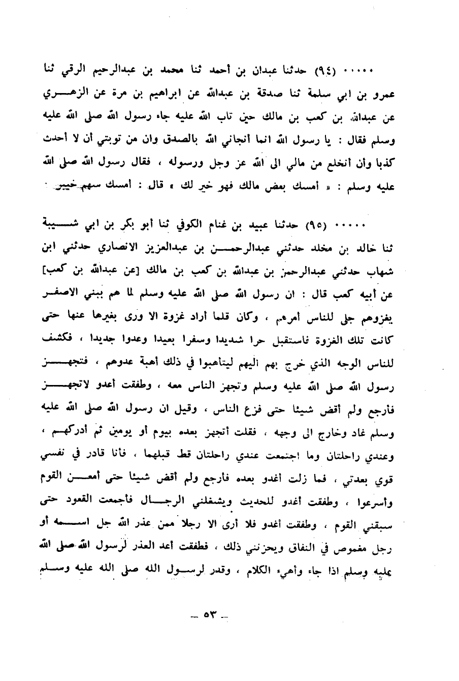 95 - حَدَّثَنَا عُبَيْدُ بْنُ غَنَّامٍ الْكُوفِيُّ، ثنا أَبُو بَكْرِ بْنُ أَبِي شَيْبَةَ، ثنا خَالِدُ بْنُ مَخْلَدٍ، حَدَّثَنِي عَبْدُ الرَّحْمَنِ بْنُ عَبْدِ الْعَزِيزِ الْأَنْصَارِيُّ، حَدَّثَنِي ابْنُ شِهَابٍ، حَدَّثَنِي عَبْدُ الرَّحْمَنِ بْنُ عَبْدِ اللهِ بْنِ كَعْبِ بْنِ مَالِكٍ، عَنْ عَبْدِ اللهِ بْنِ كَعْبٍ، عَنْ أَبِيهِ كَعْبٍ، قَالَ: إِنَّ رَسُولَ اللهِ صَلَّى اللهُ عَلَيْهِ وَسَلَّمَ لَمَّا هَمَّ بِبَنِي الْأَصْفَرِ يَغْزُوهُمْ جَلَّى لِلنَّاسِ أَمَرَهُمْ، وَكَانَ قَلَّمَا أَرَادَ غَزْوَةً إِلَّا وَرَّى بِغَيْرِهَا عَنْهَا، حَتَّى كَانَتْ تِلْكَ الْغَزْوَةِ فَاسْتَقْبَلَ حَرًّا شَدِيدًا، وَسَفَرًا بَعِيدًا، وَعَدُوًّا جَدِيدًا، فَكَشَفَ لِلنَّاسِ الْوَجْهَ الَّذِي خَرَجَ بِهِمْ إِلَيْهِمْ لِيَتَأَهَّبُوا فِي ذَلِكَ أُهْبَةَ عَدُوِّهِمْ، فَتَجَهَّزَ رَسُولُ اللهِ صَلَّى اللهُ عَلَيْهِ وَسَلَّمَ، وَتَجَهَّزَ النَّاسُ مَعَهُ وَطَفِقْتُ أَغْدُو لِأَتَجَهَّزَ فَأَرْجِعُ وَلَمْ أَقْضِ شَيْئًا، حَتَّى فَزِعَ النَّاسُ، وَقِيلَ إِنَّ رَسُولَ اللهِ صَلَّى اللهُ عَلَيْهِ وَسَلَّمَ غَادٍ وَخَارِجٌ إِلَى وَجْهِهِ، فَقُلْتُ: أَتَجَهَّزُ بَعْدَهُ بِيَوْمٍ أَوْ يَوْمَيْنِ ثُمَّ أُدْرِكُهُمْ، وَعِنْدِي رَاحِلَتَانِ، وَمَا اجْتَمَعَتْ عِنْدِي رَاحِلَتَانِ قَطُّ قَبْلَهُمَا، فَأَنَا قَادِرٌ فِي نَفْسِي، قَوِيٌّ بِعُدَّتِي، فَمَا زِلْتُ أَغْدُو بَعْدَهُ فَأَرْجِعُ وَلَمْ أَقْضِ شَيْئًا، حَتَّى أَمْعَنَ الْقَوْمُ وَأَسْرَعُوا، وَطَفِقْتُ أَغْدُو لِلْحَدِيثِ وَيَشْغَلُنِي الرِّجَالُ، فَأَجْمَعْتُ الْقُعُودَ حَتَّى سَبَقَنِي الْقَوْمُ، وَطَفِقْتُ أَغْدُو فَلَا أَرَى إِلَّا رَجُلًا مِمَّنْ عَذَّرَ اللهُ جَلَّ اسْمُهُ أَوْ رَجُلًا مَغْمُوصًا فِي النِّفَاقِ، وَيُحْزِنُنِي ذَلِكَ، فَطَفِقْتُ أُعِدُّ الْعُذْرَ لِرَسُولِ اللهِ صَلَّى اللهُ عَلَيْهِ وَسَلَّمَ إِذَا جَاءَ، وَأُهَيْيءُ الْكَلَامَ، وَقُدِّرَ لِرَسُولِ اللهِ صَلَّى اللهُ عَلَيْهِ وَسَلَّمَ -[54]- أَنْ لَا يَذْكُرَنِي حَتَّى نَزَلَ تَبُوكًا، فَقَالَ لِلنَّاسِ، وَهُوَ جَالِسٌ بِتَبُوكٍ: «مَا فَعَلَ كَعْبُ بْنُ مَالِكٍ؟» ، فَقَامَ إِلَيْهِ رَجُلٌ مِنْ قَوْمِي فَقَالَ: شَغَلَهُ بُرْدَاهُ، وَالنَّظَرُ فِي عِطْفَيْهِ، فَتَكَلَّمَ رَجُلٌ آخَرُ، فَقَالَ: وَاللهِ يَا رَسُولَ اللهِ إِنْ عَلِمْنَا إِلَّا خَيْرًا، فَصَمَتَ رَسُولُ اللهِ صَلَّى اللهُ عَلَيْهِ وَسَلَّمَ، فَلَمَّا قِيلَ إِنَّ رَسُولَ اللهِ صَلَّى اللهُ عَلَيْهِ وَسَلَّمَ قَدِمَ زَاحَ عَنِّي الْبَاطِلُ، وَمَا كُنْتُ أَجْمَعُ مِنَ الْكَذِبِ وَالْعُذْرِ، وَعَرَفْتُ أَنَّهُ لَنْ يُنَجِّيَنِي مِنْهُ إِلَّا الصِّدْقُ، فَأَجْمَعْتُ صِدْقَهُ، وَصَبَّحَ رَسُولُ اللهِ صَلَّى اللهُ عَلَيْهِ وَسَلَّمَ الْمَدِينَةَ، فَقَدِمَ فَغَدَوْتُ إِلَيْهِ، فَإِذَا هُوَ فِي النَّاسِ جَالِسٌ فِي الْمَسْجِدِ، وَكَانَ قَلَّمَا نَظَرَ إِلَيَّ دَعَانِي، فَقَالَ: «هَلُمَّ يَا كَعْبُ، §مَا خَلْفَكَ عَنِّي؟» ، وَتَبَسَّمَ تَبَسُّمَ الْمُغْضَبِ، قُلْتُ: يَا رَسُولَ اللهِ لَا عُذْرَ لِي، مَا كُنْتُ قَطُّ أَقْوَى، وَلَا أَيْسَرَ مِنِّي حِينَ تَخَلَّفْتُ عَنْكَ، وَقَدْ جَاءَ الْمُخَلَّفُونَ يَحْلِفُونَ فَيَقْبَلُ مِنْهُمْ وَيَسْتَغْفِرُ لَهُمْ، وَيَكِلُ سَرَائِرَهُمْ فِي ذَلِكَ إِلَى اللهِ عَزَّ وَجَلَّ، فَلَمَّا صَدَقَهُ قَالَ: «أَمَّا هَذَا فَقَدْ صَدَقَ، فَقُمْ حَتَّى يَقْضِيَ اللهُ فِيكَ مَا هُوَ قَاضٍ» ، فَقُمْتُ فَقَامَ إِلَيَّ رَجُلٌ مِنْ بَنِي سَلِمَةَ فَقَالَ: وَاللهِ مَا صَنَعْتَ شَيْئًا، وَاللهِ إِنْ كَانَ لَكَافِيكَ مِنْ ذَنْبِكِ الَّذِي أَذْنَبْتَ اسْتِغْفَارُ رَسُولِ الل