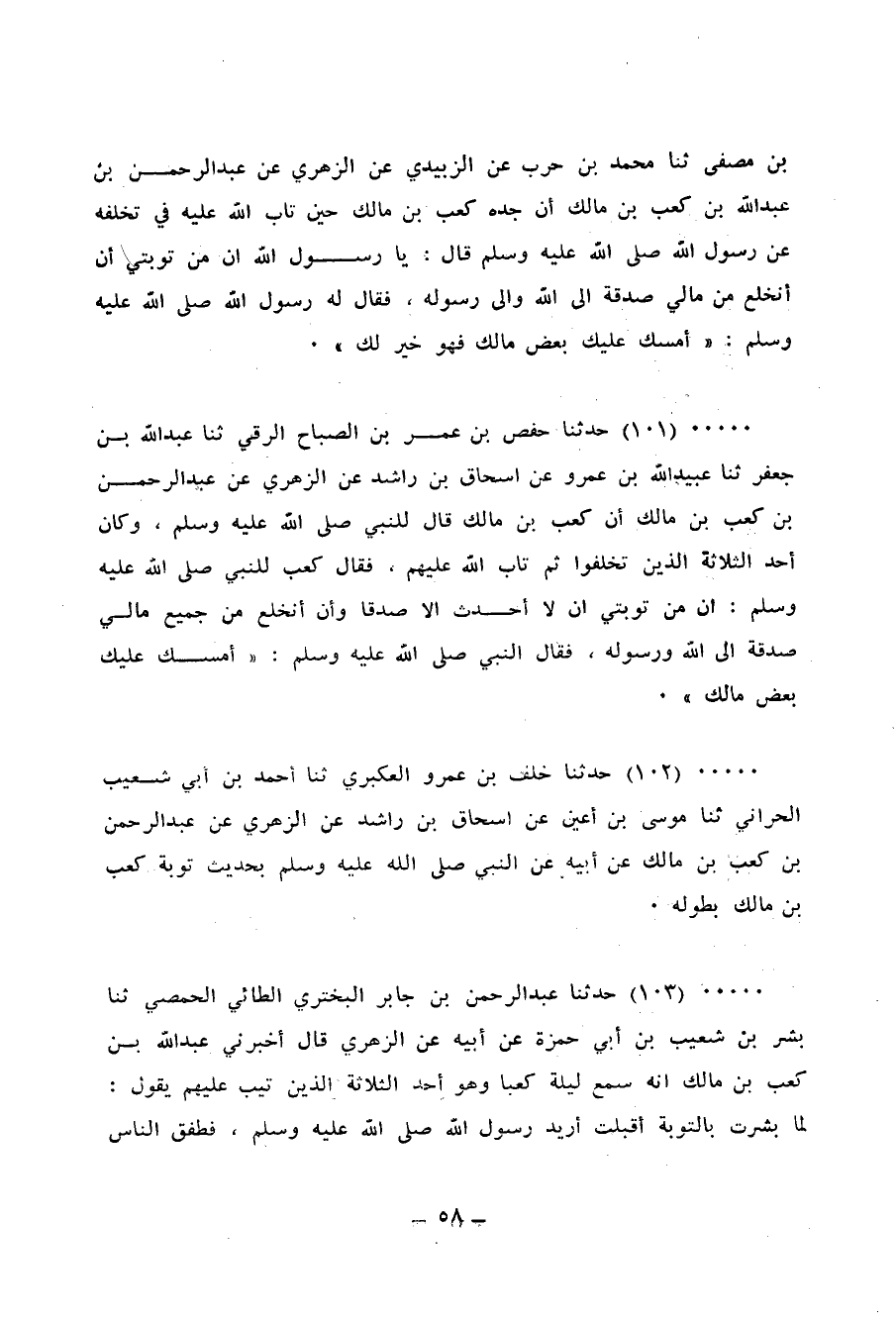 103 - حَدَّثَنَا عَبْدُ الرَّحْمَنِ بْنُ جَابِرٍ الْبَخْتَرِيُّ الطَّائِيُّ الْحِمْصِيُّ، ثنا بِشْرُ بْنُ شُعَيْبِ بْنِ أَبِي حَمْزَةَ، عَنْ أَبِيهِ، عَنِ الزُّهْرِيِّ، قَالَ: أَخْبَرَنِي عَبْدُ اللهِ بْنُ كَعْبِ بْنِ مَالِكٍ، أَنَّهُ سَمِعَ لَيْلَةً كَعْبًا، وَهُوَ أَحَدُ الثَّلَاثَةِ الَّذِينَ تِيبَ عَلَيْهِمْ، يَقُولُ: «§لَمَّا بُشِّرْتُ بِالتَّوْبَةِ أَقْبَلَتُ أُرِيدُ رَسُولَ اللهِ صَلَّى اللهُ عَلَيْهِ وَسَلَّمَ، فَطَفِقَ النَّاسُ يَتَلَقَّوْنَنِي فَوْجًا فَوْجًا يُهَنِّئُونَنِي بِتَوْبَةِ اللهِ عَلَيَّ، حَتَّى إِذَا دَخَلْتُ الْمَسْجِدَ قَامَ إِلَيَّ طَلْحَةُ بْنُ عُبَيْدِ اللهِ حَتَّى صَافَحَنِي»