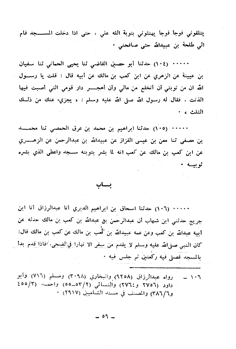 106 - حَدَّثَنَا إِسْحَاقُ بْنُ إِبْرَاهِيمَ الدَّبَرِيُّ، أنا عَبْدُ الرَّزَّاقِ، أنا ابْنُ جُرَيْجٍ، حَدَّثَنِي ابْنُ شِهَابٍ، أَنَّ عَبْدَ الرَّحْمَنِ بْنَ عَبْدِ اللهِ بْنِ كَعْبِ بْنِ مَالِكٍ، حَدَّثَهُ، عَنْ أَبِيهِ عَبْدِ اللهِ بْنِ كَعْبٍ، وَعَنْ عَمِّهِ عُبَيْدِ اللهِ بْنِ كَعْبِ بْنِ مَالِكٍ، عَنْ كَعْبِ بْنِ مَالِكٍ، قَالَ: «كَانَ النَّبِيُّ صَلَّى اللهُ عَلَيْهِ وَسَلَّمَ §لَا يَقْدُمُ مِنْ سَفَرٍ إِلَّا نَهَارًا فِي الضُّحَى، فَإِذَا قَدِمَ بَدَأَ بِالْمَسْجِدِ فَصَلَّى فِيهِ رَكْعَتَيْنِ ثُمُّ جَلَسَ فِيهِ»