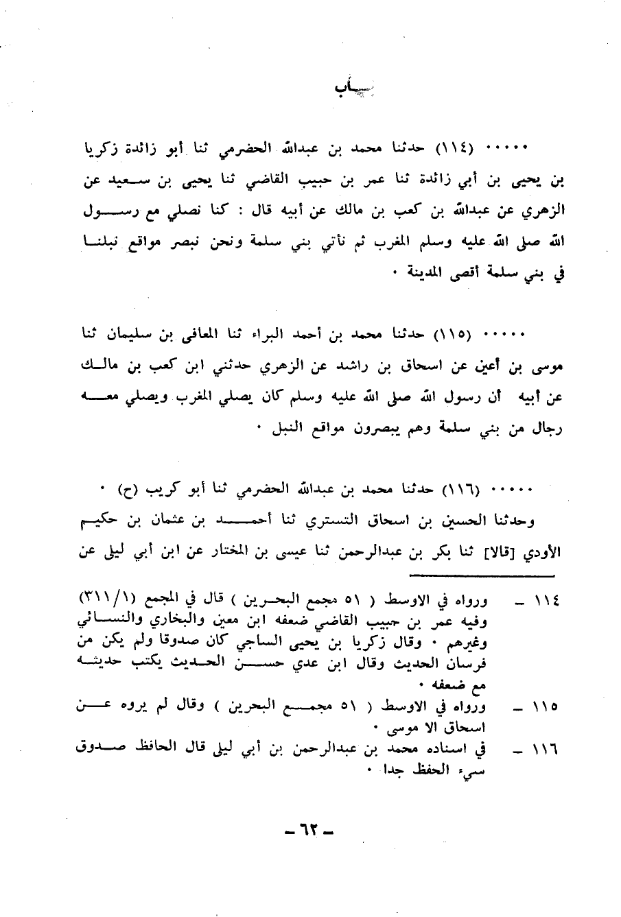 114 - حَدَّثَنَا مُحَمَّدُ بْنُ عَبْدِ اللهِ الْحَضْرَمِيُّ، ثنا أَبُو زَائِدَةَ زَكَرِيَّا بْنُ يَحْيَى بْنِ أَبِي زَائِدَةَ، ثنا عُمَرُ بْنُ حَبِيبٍ الْقَاضِي، ثنا يَحْيَى بْنُ سَعِيدٍ، عَنِ الزُّهْرِيِّ، عَنْ عَبْدِ اللهِ بْنِ كَعْبِ بْنِ مَالِكٍ، عَنْ أَبِيهِ، قَالَ: كُنَّا §نُصَلِّي مَعَ رَسُولِ اللهِ صَلَّى اللهُ عَلَيْهِ وَسَلَّمَ الْمَغْرِبَ ثُمَّ نَأْتِي بَنِي سَلِمَةَ وَنَحْنُ نُبْصِرُ مَوَاقِعَ نَبْلِنَا فِي بَنِي سَلِمَةَ أَقْصَى الْمَدِينَةِ "