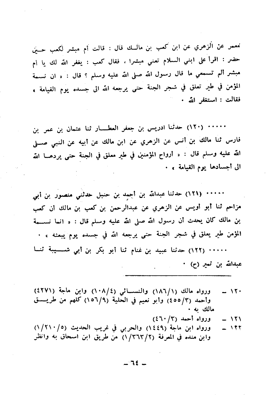 122 - حَدَّثَنَا عُبَيْدُ بْنُ غَنَّامٍ، ثنا أَبُو بَكْرِ بْنُ أَبِي شَيْبَةَ، ثنا عَبْدُ اللهِ بْنُ نُمَيْرٍ، ح وَحَدَّثَنَا عَلِيُّ بْنُ عَبْدِ الْعَزِيزِ، ثنا ابْنُ الْأَصْبَهَانِيِّ، ثنا عَبْدُ الرَّحْمَنِ بْنُ مُحَمَّدٍ الْمُحَارِبِيُّ، كِلَاهُمَا عَنْ مُحَمَّدِ بْنِ إِسْحَاقَ، عَنِ الْحَارِثِ بْنِ فُضَيْلٍ، عَنِ الزُّهْرِيِّ، عَنْ عَبْدِ الرَّحْمَنِ بْنِ كَعْبِ بْنِ مَالِكٍ، قَالَ: لَمَّا حَضَرَتْ كَعْبَ بْنَ مَالِكٍ الْوَفَاةُ دَخَلْتُ عَلَيْهِ أُمُّ بِشْرٍ بِنْتُ الْبَرَاءِ بْنِ مَعْرُورٍ، فَقَالَتْ: يَا أَبَا عَبْدِ الرَّحْمَنِ إِنْ لَقِيتَ ابْنِي فَأَقْرِئْهُ مِنِّي السَّلَامَ، فَقَالَ: يَغْفِرُ اللهُ لَكِ يَا أُمَّ بِشْرٍ، نَحْنُ أَشْغَلُ مِنْ ذَلِكَ، فَقَالَتْ: أَبَا عَبْدِ الرَّحْمَنِ أَمَا سَمِعْتَ رَسُولَ اللهِ صَلَّى اللهُ عَلَيْهِ وَسَلَّمَ، يَقُولُ: «إِنَّ §أَرْوَاحِ الْمُؤْمِنِينَ فِي أَجْوَافِ طَيْرٍ تَعْلُقُ بِشَجَرِ الْجَنَّةِ» ، قَالَ: بَلَى، قَالَتْ: فَهُوَ كَذَلِكَ