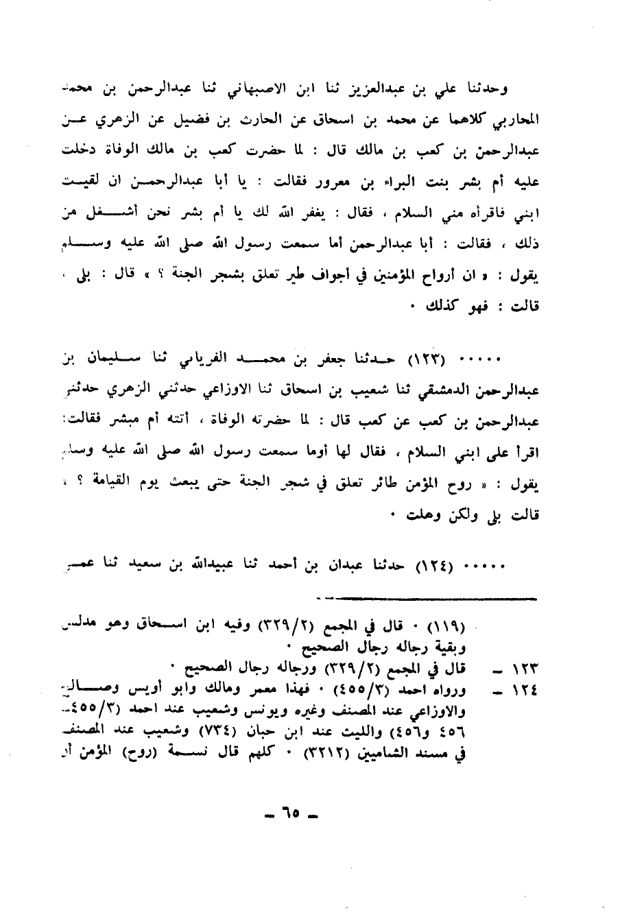 123 - حَدَّثَنَا جَعْفَرُ بْنُ مُحَمَّدٍ الْفِرْيَابِيُّ، ثنا سُلَيْمَانُ بْنُ عَبْدِ الرَّحْمَنِ الدِّمَشْقِيُّ، ثنا شُعَيْبُ بْنُ إِسْحَاقَ، ثنا الْأَوْزَاعِيُّ، حَدَّثَنِي الزُّهْرِيُّ، حَدَّثَنِي عَبْدُ الرَّحْمَنِ بْنُ كَعْبٍ، عَنْ كَعْبٍ، قَالَ: لَمَّا حَضَرَتْهُ الْوَفَاةُ أَتَتْهُ أُمُّ مُبَشِّرٍ، فَقَالَتْ: اقْرَأْ عَلَى ابْنِي السَّلَامَ، فَقَالَ لَهَا: أَوَمَا سَمِعْتِ رَسُولَ اللهِ صَلَّى اللهُ عَلَيْهِ وَسَلَّمَ، يَقُولُ: «§رُوحُ الْمُؤْمِنِ طَائِرٌ تَعْلُقُ فِي شَجَرِ الْجَنَّةِ حَتَّى يُبْعَثَ يَوْمَ الْقِيَامَةِ» ، قَالَتْ: بَلَى، وَلَكِنْ وَهِلْتُ