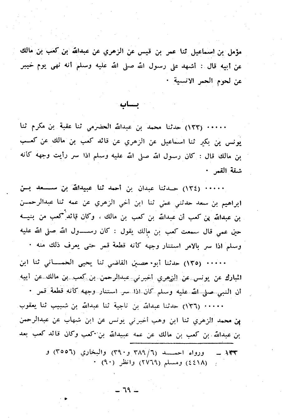 135 - حَدَّثَنَا أَبُو حُصَيْنٍ الْقَاضِي، ثنا يَحْيَى الْحِمَّانِيُّ، ثنا ابْنُ الْمُبَارَكِ، عَنْ يُونُسَ، عَنِ الزُّهْرِيِّ، أَخْبَرَنِي عَبْدُ الرَّحْمَنِ بْنُ كَعْبِ بْنِ مَالِكٍ، عَنْ أَبِيهِ: «أَنَّ النَّبِيَّ صَلَّى اللهُ عَلَيْهِ وَسَلَّمَ كَانَ» §إِذَا سُرَّ اسْتَنَارَ وَجْهُهُ كَأَنَّهُ قِطْعَةُ قَمَرٍ "