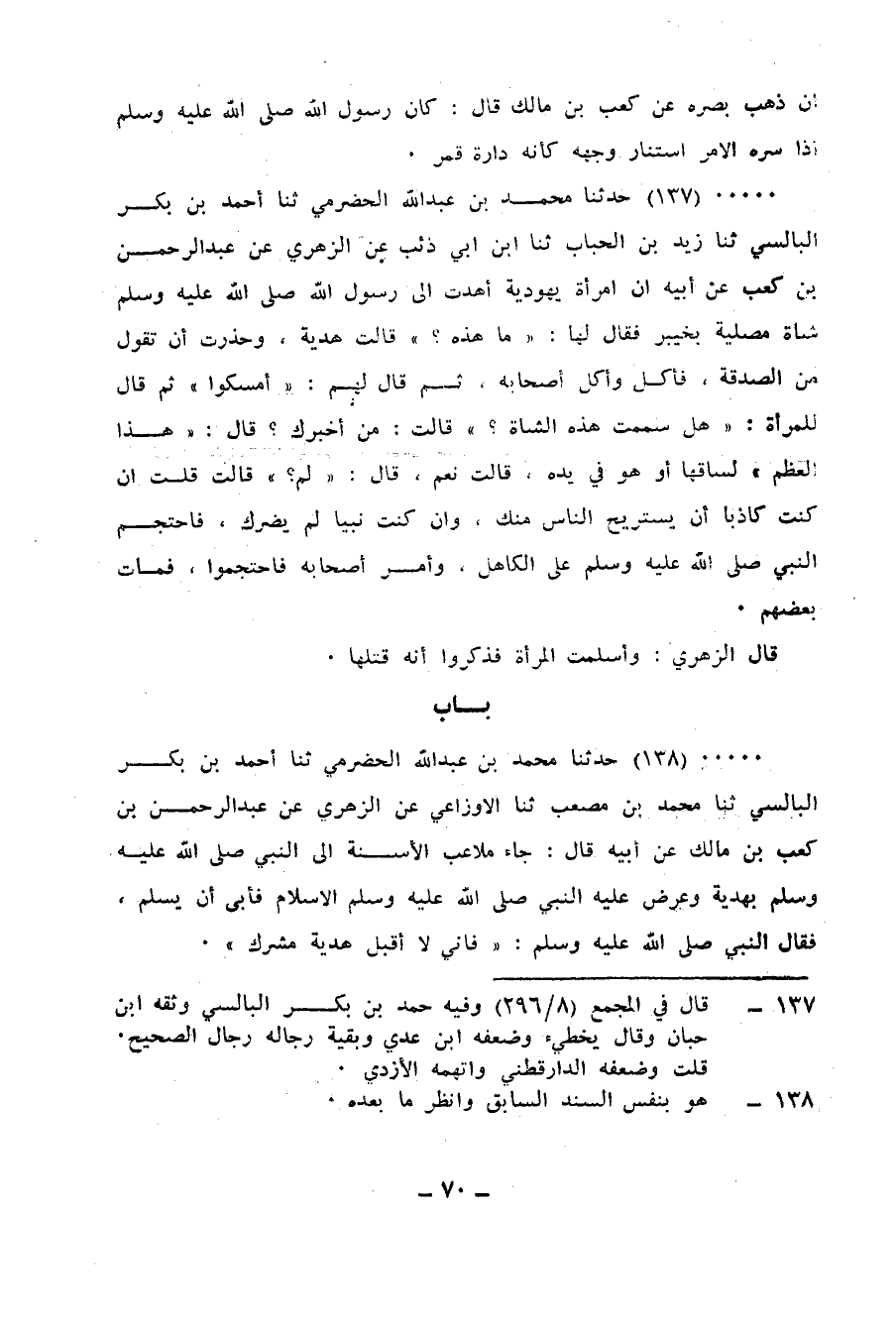 137 - حَدَّثَنَا مُحَمَّدُ بْنُ عَبْدِ اللهِ الْحَضْرَمِيُّ، ثنا أَحْمَدُ بْنُ بَكْرٍ الْبَالِسِيُّ، ثنا زَيْدُ بْنُ الْحُبَابِ، ثنا ابْنُ أَبِي ذِئْبٍ، عَنِ الزُّهْرِيِّ، عَنْ عَبْدِ الرَّحْمَنِ بْنِ كَعْبٍ، عَنْ أَبِيهِ، أَنَّ §امْرَأَةً يَهُودِيَّةً أَهْدَتْ إِلَى رَسُولِ اللهِ صَلَّى اللهُ عَلَيْهِ وَسَلَّمَ شَاةً مَصْلِيَّةً بِخَيْبَرَ، فَقَالَ لَهَا: «مَا هَذِهِ؟» ، قَالَتْ: هَدِيَّةٌ، وَحَذِرَتْ أَنْ تَقُولَ مِنَ الصَّدَقَةِ، فَأَكَلَ وَأَكَلَ أَصْحَابُهُ، ثُمَّ قَالَ لَهُمْ: «أَمْسِكُوا» ، ثُمَّ قَالَ لِلْمَرْأَةِ: «هَلْ سَمَمْتِ هَذِهِ الشَّاةَ؟» ، قَالَتْ: مَنْ أَخْبَرَكَ؟، قَالَ: «هَذَاِ الْعَظْمُ» لِسَاقِهَا أَوْ هُوَ فِي يَدَهِ، قَالَتْ: نَعَمْ، قَالَ: «لِمَ؟» ، قَالَتْ: قُلْتُ: إِنْ كُنْتَ كَاذِبًا أَنْ يَسْتَرِيحَ النَّاسُ مِنْكَ، وَإِنْ كُنْتَ نَبِيًّا لَمْ يَضُرَّكَ، فَاحْتَجَمَ النَّبِيُّ صَلَّى اللهُ عَلَيْهِ وَسَلَّمَ عَلَى الْكَاهِلِ، وَأَمَرَ أَصْحَابَهُ فَاحْتَجِمُوا، فَمَاتَ بَعْضُهُمْ. قَالَ الزُّهْرِيُّ: «وَأَسْلَمَتِ الْمَرْأَةُ، فَذَكَرُوا أَنَّهُ قَتَلَهَا»