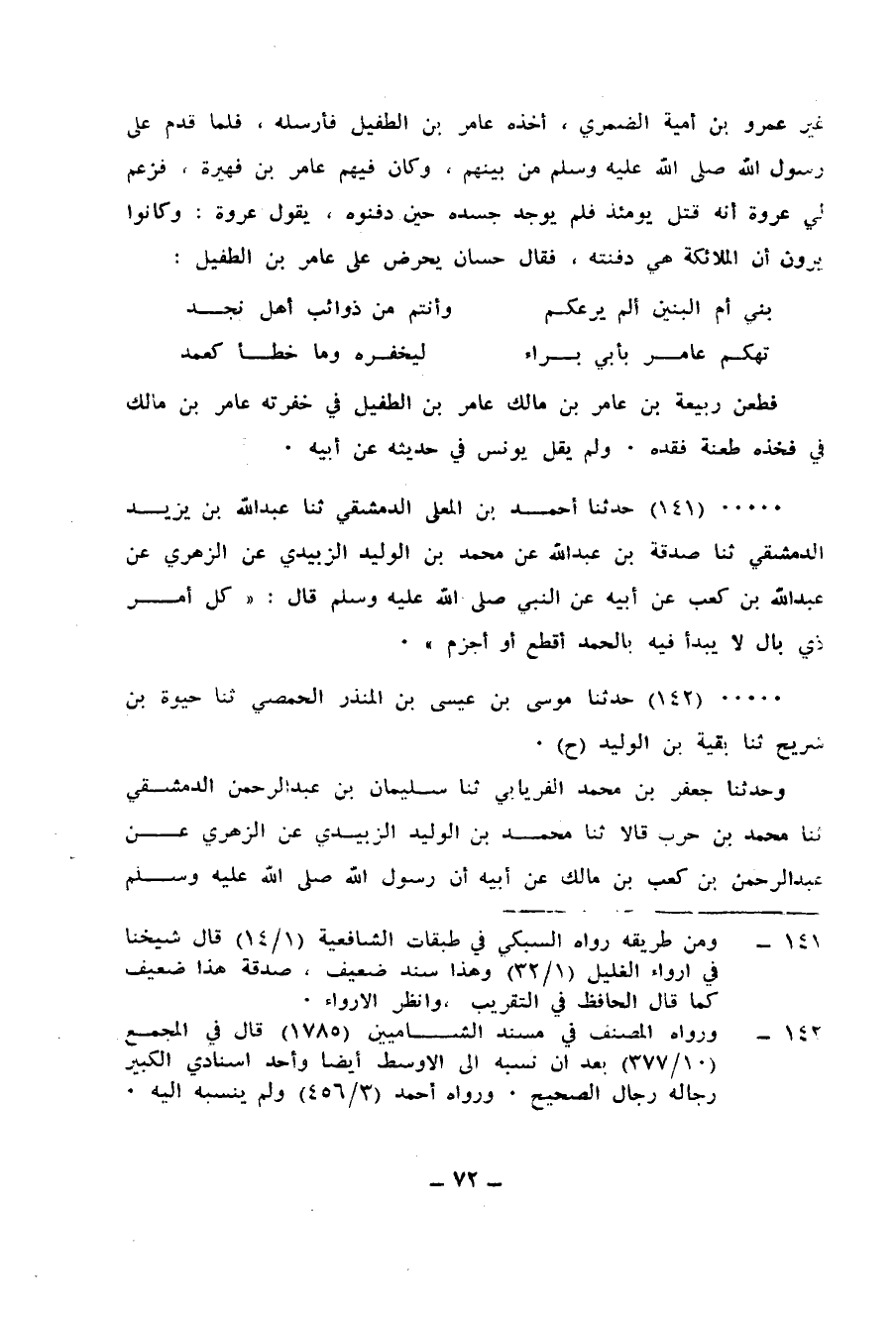 141 - حَدَّثَنَا أَحْمَدُ بْنُ الْمُعَلَّى الدِّمَشْقِيُّ، ثنا عَبْدُ اللهِ بْنُ يَزِيدَ الدِّمَشْقِيُّ، ثنا صَدَقَةُ بْنُ عَبْدِ اللهِ، عَنْ مُحَمَّدِ بْنِ الْوَلِيدِ الزُّبَيْدِيِّ، عَنِ الزُّهْرِيِّ، عَنْ عَبْدِ اللهِ بْنِ كَعْبٍ، عَنْ أَبِيهِ، عَنِ النَّبِيِّ صَلَّى اللهُ عَلَيْهِ وَسَلَّمَ، قَالَ: «§كُلُّ أَمَرٍ ذِي بَالٍ لَا يُبْدَأُ فِيهِ بِالْحَمْدِ أَقْطَعُ أَوْ أَجْزَمُ»
