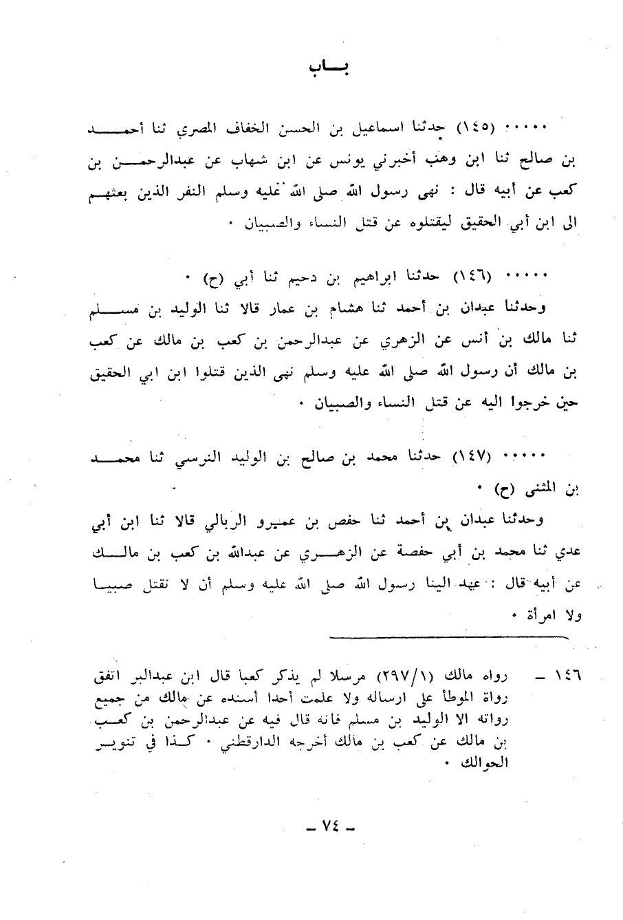 145 - حَدَّثَنَا إِسْمَاعِيلُ بْنُ الْحَسَنِ الْخَفَّافُ الْمِصْرِيُّ، ثنا أَحْمَدُ بْنُ صَالِحٍ، ثنا ابْنُ وَهْبٍ، أَخْبَرَنِي يُونُسُ، عَنِ ابْنِ شِهَابٍ، عَنْ عَبْدِ الرَّحْمَنِ بْنِ كَعْبٍ، عَنْ أَبِيهِ، قَالَ: «§نَهَى رَسُولُ اللهِ صَلَّى اللهُ عَلَيْهِ وَسَلَّمَ النَّفْرَ الَّذِينَ بَعَثَهُمْ إِلَى ابْنِ أَبِي الْحُقَيْقِ لِيَقْتُلُوهُ عَنْ قَتَلِ النِّسَاءِ وَالصِّبْيَانِ»