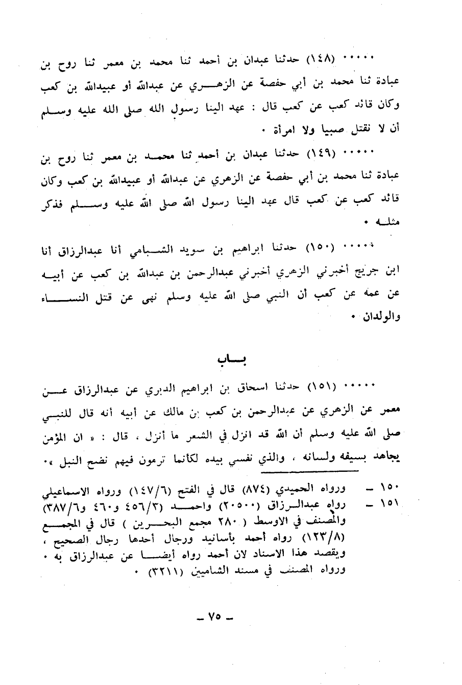 150 - حَدَّثَنَا إِبْرَاهِيمُ بْنُ سُوَيْدٍ الشِّبَامِيُّ، أنا عَبْدُ الرَّزَّاقِ، أنا ابْنُ جُرَيْجٍ، أَخْبَرَنِي الزُّهْرِيُّ، أَخْبَرَنِي عَبْدُ الرَّحْمَنِ بْنُ عَبْدِ اللهِ بْنِ كَعْبٍ، عَنْ أَبِيهِ، عَنْ عَمِّهِ، عَنْ كَعْبٍ: «أَنَّ النَّبِيَّ صَلَّى اللهُ عَلَيْهِ وَسَلَّمَ» §نَهَى عَنْ قَتَلِ النِّسَاءِ وَالْوِلْدَانِ "