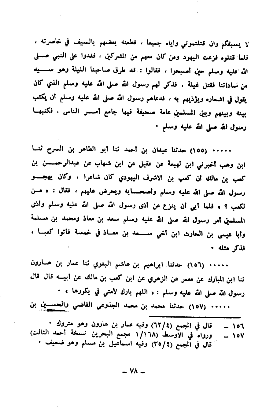 155 - حَدَّثَنَا عَبْدَانُ بْنُ أَحْمَدَ، ثنا أَبُو الطَّاهِرِ بْنُ السَّرْحِ، ثنا ابْنُ وَهْبٍ، أَخْبَرَنِي ابْنُ لَهِيعَةَ، عَنْ عُقَيْلٍ، عَنِ ابْنِ شِهَابٍ، عَنْ عَبْدِ الرَّحْمَنِ بْنِ كَعْبِ بْنِ مَالِكٍ، أَنَّ كَعْبَ بْنَ الْأَشْرَفِ الْيَهُودِيَّ، كَانَ شَاعِرًا وَكَانَ يَهْجُو رَسُولَ اللهِ صَلَّى اللهُ عَلَيْهِ وَسَلَّمَ وَأَصْحَابَهُ وَيُحَرِّضُ عَلَيْهِمْ، فَقَالَ: «§مَنْ لِكَعْبٍ؟» ، فَلَمَّا أَبَى أَنْ يَنْزِعَ عَنْ أَذَى رَسُولِ اللهِ صَلَّى اللهُ عَلَيْهِ وَسَلَّمَ وَأَذَى الْمُسْلِمِينَ أَمَرَ رَسُولُ اللهِ صَلَّى اللهُ عَلَيْهِ وَسَلَّمَ سَعْدَ بْنَ مُعَاذٍ، وَمُحَمَّدَ بْنَ مَسْلَمَةَ، وَأَبَا عِيسَى بْنَ الْحَارِثِ ابْنَ أَخِي سَعْدِ بْنِ مُعَاذٍ فِي خَمْسَةٍ فَأَتَوْا كَعْبًا. فَذَكَرَ مِثْلَهُ