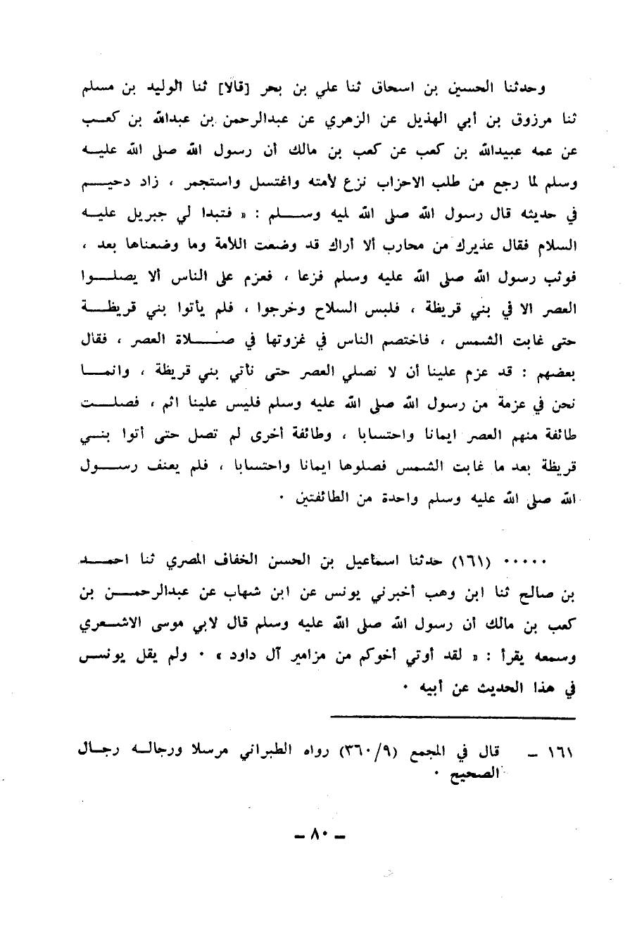 161 - حَدَّثَنَا إِسْمَاعِيلُ بْنُ الْحَسَنِ الْخَفَّافُ الْمِصْرِيُّ، ثنا أَحْمَدُ بْنُ صَالِحٍ، ثنا ابْنُ وَهْبٍ، أَخْبَرَنِي يُونُسُ، عَنِ ابْنِ شِهَابٍ، عَنْ عَبْدِ الرَّحْمَنِ بْنِ كَعْبِ بْنِ مَالِكٍ، أَنَّ رَسُولَ اللهِ صَلَّى اللهُ عَلَيْهِ وَسَلَّمَ قَالَ لِأَبِي مُوسَى الْأَشْعَرِيِّ، وَسَمِعَهُ يَقْرَأُ: «§لَقَدْ أُوتِيَ أَخُوكُمْ مِنْ مَزَامِيرِ آلِ دَاوُدَ» . «وَلَمْ يَقُلْ يُونُسُ فِي هَذَا الْحَدِيثِ عَنْ أَبِيهِ» ة