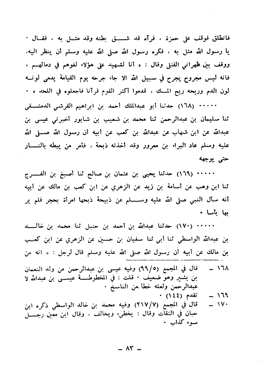 170 - حَدَّثَنَا عَبْدُ اللهِ بْنُ أَحْمَدَ بْنِ حَنْبَلٍ، ثنا مُحَمَّدُ بْنُ خَالِدِ بْنِ عَبْدِ اللهِ الْوَاسِطِيُّ، ثنا أَبِي، ثنا سُفْيَانُ بْنُ حُسَيْنٍ، عَنِ الزُّهْرِيِّ، عَنِ ابْنِ كَعْبِ بْنِ مَالِكٍ، عَنْ أَبِيهِ، أَنَّ رَسُولَ اللهِ صَلَّى اللهُ عَلَيْهِ وَسَلَّمَ قَالَ لِرَجُلٍ إِنَّهُ مِنْ أَهْلِ النَّارِ، فَجَعَلَ النَّاسُ يَنْتَظِرُونَ أَمْرَهُ، حَتَّى إِذَا كَانَ يَوْمُ حُنَيْنٍ قَاتَلَ فَأَبْلَى، فَأَخْبَرُوا بِذَلِكَ رَسُولَ اللهِ صَلَّى اللهُ عَلَيْهِ وَسَلَّمَ، فَقَالَ: «إِنَّهُ مِنْ أَهْلِ النَّارِ» ، قَالَ فَجُرِحَ الرَّجُلُ، فَأَخَذَ سَهْمًا مِنْ كِنَانَتِهِ فَنَحَرَ نَفْسَهُ، فَقَالُوا: يَا رَسُولَ اللهِ قَدْ صَدَقَ اللهُ حَدِيثَكَ، فَقَالَ رَسُولُ اللهِ صَلَّى اللهُ عَلَيْهِ وَسَلَّمَ: «قُمْ يَا بِلَالُ فَنَادِ أَنَّهُ §لَا يَدْخُلُ الْجَنَّةَ إِلَّا مُؤْمِنٌ، وَأَنَّ اللهَ عَزَّ وَجَلَّ لَيُؤَيِّدُ الدِّينَ بِالرَّجُلِ الْفَاجِرِ» -[84]-.