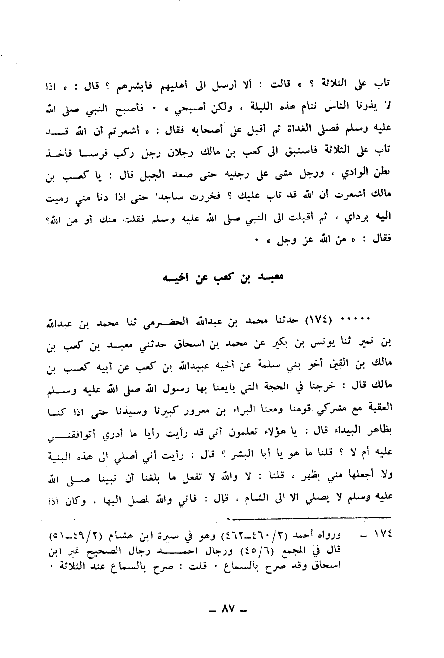 174 - حَدَّثَنَا مُحَمَّدُ بْنُ عَبْدِ اللهِ الْحَضْرَمِيُّ، ثنا مُحَمَّدُ بْنُ عَبْدِ اللهِ بْنِ نُمَيْرٍ، ثنا يُونُسُ بْنُ بُكَيْرٍ، عَنْ مُحَمَّدِ بْنِ إِسْحَاقَ، حَدَّثَنِي مَعْبَدُ بْنُ كَعْبِ بْنِ مَالِكِ بْنِ الْقَيْنِ، أَخُو بَنِي سَلَمَةَ، عَنْ أَخِيهِ عُبَيْدِ اللهِ بْنِ كَعْبٍ، عَنْ أَبِيهِ كَعْبِ بْنِ مَالِكٍ، قَالَ: §خَرَجْنَا فِي الْحِجَّةِ الَّتِي بَايَعْنَا بِهَا رَسُولَ اللهِ صَلَّى اللهُ عَلَيْهِ وَسَلَّمَ الْعَقَبَةَ مَعَ مُشْرِكِي قَوْمِنَا، وَمَعَنَا الْبَرَاءُ بْنُ مَعْرُورٍ كَبِيرُنَا وَسَيِّدُنَا، حَتَّى إِذَا كُنَّا بِظَاهِرِ الْبَيْدَاءِ، قَالَ: يَا هَؤُلَاءِ تَعْلَمُونَ أَنِّي قَدْ رَأَيْتُ رَأَيًا، مَا أَدْرِي أَتُوَافِقُونِي عَلَيْهِ أَمْ لَا؟، قُلْنَا: مَا هُوَ يَا أَبَا الْبَشَرِ؟، قَالَ: رَأَيْتُ أَنِّي أُصَلِّي إِلَى هَذِهِ الْبَنِيَّةِ وَلَا أَجْعَلُهَا مِنِّي بِظَهْرٍ، قُلْنَا: لَا وَاللهِ لَا تَفْعَلُ، مَا بَلَغَنَا أَنَّ نَبِيَّنَا صَلَّى اللهُ عَلَيْهِ وَسَلَّمَ لَا يُصَلِّي إِلَّا إِلَى الشَّامِ، قَالَ: فَإِنِّي وَاللهِ لِمُصَلٍّ إِلَيْهَا، وَكَانَ إِذَا -[88]- حَضَرَتِ الصَّلَاةُ تَوَجَّهَ إِلَى الْكَعْبَةِ وَتَوَجَّهْنَا إِلَى الشَّامِ، حَتَّى قَدِمْنَا مَكَّةَ، فَقَالَ لِي الْبَرَاءُ بْنُ مَعْرُورٍ: يَا ابْنَ أَخِي انْطَلَقْ بِنَا إِلَى رَسُولِ اللهِ حَتَّى نَسْأَلَهُ عَمَّا صَنَعْنَا فِي سَفَرِنَا هَذَا، فَلَقَدْ وَجَدْتُ فِي نَفْسِي مِنْهُ بِخِلَافِكُمْ إِيَّايَ، فَخَرَجْنَا نَسْأَلُ رَسُولَ اللهِ صَلَّى اللهُ عَلَيْهِ وَسَلَّمَ فَلَقِيَنَا رَجُلٌ بِالْأَبْطَحِ، فَقُلْنَا لَهُ: تَدُلُّنَا عَلَى مُحَمَّدِ بْنِ عَبْدِ اللهِ بْنِ عَبْدِ الْمُطَّلِبِ، قَالَ: وَهَلْ تَعْرِفَانِهِ إِذَا رَأْيُتَمَاهُ؟، قُلْنَا: لَا وَاللهِ مَا نَعْرِفُهُ، وَلَمْ نَكُنْ رَأَيْنَا رَسُولَ اللهِ صَلَّى اللهُ عَلَيْهِ وَسَلَّمَ، قَالَ: فَهَلْ تَعْرَفَانِ الْعَبَّاسَ بْنَ عَبْدِ الْمُطَّلِبِ؟، قُلْنَا: نَعَمْ، وَقَدْ كُنَّا نَعْرِفُهُ، كَانَ يَخْتَلِفُ إِلَيْنَا بِالتِّجَارَةِ، قَالَ: فَإِذَا دَخَلْتُمَا الْمَسْجِدَ فَانْظُرَا الْعَبَّاسَ فَهُوَ الرَّجُلُ الَّذِي مَعَهُ، فَدَخَلْنَا الْمَسْجِدَ وَرَسُولُ اللهِ صَلَّى اللهُ عَلَيْهِ وَسَلَّمَ وَالْعَبَّاسُ فِي نَاحِيَةِ الْمَسْجِدِ جَالِسَانِ، فَسَلَّمْنَا وَجَلَسْنَا، فَقَالَ رَسُولُ اللهِ صَلَّى اللهُ عَلَيْهِ وَسَلَّمَ: «هَلْ تَعْرِفُ هَذَيْنِ الرَّجُلَيْنِ؟» ، فَلَمَّا انْفَتَلَ، قَالَ: نَعَمْ، هَذَا الْبَرَاءُ بْنُ مَعْرُورٍ سَيِّدُ قَوْمِهِ، وَهَذَا كَعْبُ بْنُ مَالِكٍ، فَوَاللهِ مَا أَنْسَى قَوْلَ رَسُولِ اللهِ صَلَّى اللهُ عَلَيْهِ وَسَلَّمَ: «الشَّاعِرَ؟» ، قَالَ: نَعَمْ، فَقَالَ لَهُ الْبَرَاءُ بْنُ مَعْرُورٍ: يَا رَسُولَ اللهِ إِنِّي قَدْ كُنْتُ رَأَيْتُ فِي سَفَرِي هَذَا رَأَيًا قَدْ أَحْبَبْتُ أَنْ أَسْأَلَكَ عَنْهُ لَتُخْبِرَنِّي عَمَّا صَنَعْتُ فِيهِ، قَالَ: «وَمَا ذَلِكَ؟» ، قَالَ: رَأَيْتُ أَنْ لَا أَجْعَلَ هَذِهِ الْبَنِيَّةَ مِنِّي بِظَهْرٍ، فَصَلَّيْتُ إِلَيْهَا، فَقَالَ رَسُولُ اللهِ صَلَّى اللهُ عَلَيْهِ وَسَلَّمَ: «قَدْ كُنْتَ عَلَى قِبْلَةٍ لَوْ صَبَرْتَ إِلَيْهَا» ، فَرَجَعَ إِلَى قِبْلَةِ رَسُولِ اللهِ صَلَّى اللهُ عَلَيْهِ وَسَلَّمَ، وَأَهْلُهُ يَقُولُونَ: قَدْ مَاتَ عَلَيْهَا، وَنَحْنُ أَعْلَمُ بِهِ قَدْ رَجَعَ إِلَى قِبْلَةِ رَسُولِ اللهِ فَصَلَّى مَعَنَا إِلَى الشَّامِ