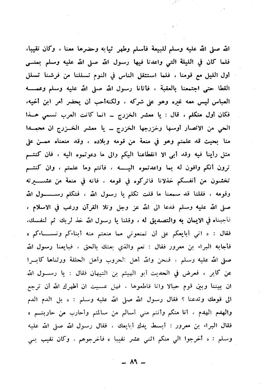 رَسُولُ اللهِ صَلَّى اللهُ عَلَيْهِ وَسَلَّمَ لِلْبَيْعَةِ، فَأَسْلَمَ وَطَهِّرَ ثِيَابَهُ وَحَضَرَهَا مَعَنَا، وَكَانَ نَقِيبًا، فَلَمَّا كَانَ فِي اللَّيْلَةِ الَّتِي وَاعَدَنَا فِيهَا رَسُولُ اللهِ صَلَّى اللهُ عَلَيْهِ وَسَلَّمَ بِمِنًى أَوَّلَ اللَّيْلِ مَعَ قَوْمِنَا، فَلَمَّا اسْتَثْقَلَ النَّاسُ فِي النَّوْمِ تَسَلَّلْنَا مِنْ فُرُشِنَا تَسَلُّلَ الْقَطَا، حَتَّى اجْتَمَعْنَا بِالْعَقَبَةِ، فَأَتَانَا رَسُولُ اللهِ صَلَّى اللهُ عَلَيْهِ وَسَلَّمَ وَعَمُّهُ الْعَبَّاسُ لَيْسَ مَعَهُ غَيْرُهُ وَهُوَ عَلَى شِرْكِهِ، وَلَكِنَّهُ أَحَبَّ أَنْ يَحْضُرَ أَمَرَ ابْنِ أَخِيهِ، فَكَانَ أَوَّلَ مُتَكَلِّمٍ، قَالَ: يَا مَعْشَرَ الْخَزْرَجِ ـ إِنَّمَا كَانَتِ الْعَرَبُ تُسَمِّي هَذَا الْحَيَّ مِنَ الْأَنْصَارِ أَوْسَهَا وَخَزْرَجَهَا الْخَزْرَجَ ـ يَا مَعْشَرَ الْخَزْرَجِ إِنَّ مُحَمَّدًا مِنَّا بِحَيْثُ قَدْ عَلِمْتُمْ، وَهُوَ فِي مَنَعَةٍ مِنْ قَوْمِهِ وَبِلَادِهِ، وَقَدْ مَنَعْنَاهُ مِمَّنْ عَلَى مِثْلِ رَأْيِنَا فِيهِ، وَقَدْ أَبَى إِلَّا انْقِطَاعَنَا إِلَيْكُمْ وَإِلَى مَا دَعَوْتُمُوهُ إِلَيْهِ، فَإِنْ كُنْتُمْ تَرَوْنَ أَنَّكُمْ وَافُونَ لَهُ بِمَا واَعَدْتُمُوهُ إِلَيْهِ فَأَنْتُمْ وَمَا عَلِمْتُمْ، وَإِنْ كُنْتُمْ تَخْشَوْنَ مِنْ أَنْفُسِكُمْ خِذْلَانًا فَاتْرُكُوهُ فِي قَوْمِهِ، فَإِنَّهُ فِي مَنَعَةٍ مِنْ عَشِيرَتِهِ وَقَوْمِهِ، فَقُلْنَا: قَدْ سَمِعْنَا مَا قُلْتَ، تَكَلَّمْ يَا رَسُولَ اللهِ فَتَكَلَّمَ رَسُولُ اللهِ صَلَّى اللهُ عَلَيْهِ وَسَلَّمَ فَدَعَا إِلَى اللهِ عَزَّ وَجَلَّ وَتَلَا الْقُرْآنَ وَرَغَّبَ فِي الْإِسْلَامِ، فَأَجَبْنَاهُ فِي الْإِيمَانِ بِهِ وَالتَّصْدِيقِ لَهُ، وَقُلْنَا: يَا رَسُولَ اللهِ خُذْ لِرَبِّكَ ثُمَّ لِنَفْسِكَ، فَقَالَ: «إِنِّي §أُبَايِعُكُمْ عَلَى أَنْ تَمْنَعُونِي مِمَّا مَنَعْتُمْ مِنْهُ أَبْنَاءَكُمْ وَنِسَاءَكُمْ» ، فَأَجَابَهُ الْبَرَاءُ بْنُ مَعْرُورٍ فَقَالَ: نَعَمْ، وَالَّذِي بَعَثَكَ بِالْحَقِّ، فَبَايَعْنَا رَسُولَ اللهِ صَلَّى اللهُ عَلَيْهِ وَسَلَّمَ، فَنَحْنُ وَاللهِ أَهْلُ الْحُرُوبِ وَأَهْلُ الْحَلْقَةِ وَرِثْنَاهَا كَابِرًا عَنْ كَابِرٍ، فَعَرَضَ فِي الْحَدِيثِ أَبُو الْهَيْثَمِ بْنُ التَّيْهَانِ فَقَالَ: يَا رَسُولَ اللهِ إِنَّ بَيْنَنَا وَبَيْنَ قَوْمٍ حِبَالًا، وَإِنَّا لَقَاطِعُوهَا، فَهَلْ عَسَيْتَ إِنْ أَظْهَرَكَ اللهُ أَنْ تَرْجِعَ إِلَى قَوْمِكَ وَتَدَعَنَا؟، فَقَالَ رَسُولُ اللهِ صَلَّى اللهُ عَلَيْهِ وَسَلَّمَ: «بَلِ الدَّمُ الدَّمُ، وَالْهَدْمُ الْهَدْمُ، أَنَا مِنْكُمْ وَأَنْتُمْ مِنِّي، أُسَالِمُ مَنْ سَالَمْتُمْ، وَأُحَارِبُ مَنْ حَارَبْتُمْ» ، فَقَالَ الْبَرَاءُ بْنُ مَعْرُورٍ: ابْسُطْ يَدَكَ أُبَايِعْكَ، فَقَالَ رَسُولُ اللهِ صَلَّى اللهُ عَلَيْهِ وَسَلَّمَ: «أَخْرِجُوا إِلَيَّ مِنْكُمُ اثْنَيْ عَشَرَ نَقِيبًا» ، فَأَخْرَجُوهُمْ، وَكَانَ نَقِيبَ بَنِي