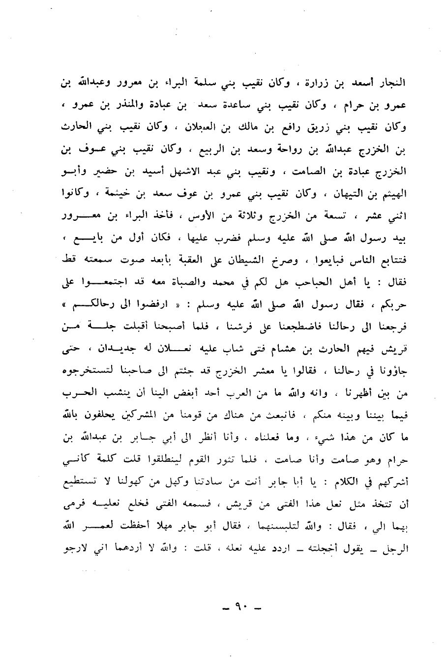 النَّجَّارِ أَسْعَدُ بْنُ زُرَارَةَ، وَكَانَ نَقِيبُ بَنِي سَلِمَةَ الْبَرَاءُ بْنُ مَعْرُورٍ وَعَبْدُ اللهِ بْنُ عَمْرِو بْنِ حَرَامٍ، وَكَانَ نَقِيبُ بَنِي سَاعِدَةَ سَعْدُ بْنُ عُبَادَةَ، وَالْمُنْذِرُ بْنُ عَمْرٍو، وَكَانَ نَقِيبَ بَنِي زُرَيْقٍ رَافِعُ بْنُ مَالِكِ بْنِ الْعَجْلَانِ، وَكَانَ نَقِيبَ بَنِي الْحَارِثِ بْنِ الْخَزْرَجِ عَبْدُ اللهِ بْنُ رَوَاحَةَ وَسَعْدُ بْنُ الرَّبِيعِ، وَكَانَ نَقِيبَ بَنِي عَوْفِ بْنِ الْخَزْرَجِ عُبَادَةُ بْنُ الصَّامِتِ، وَنقيبَ بَنِي عَبْدِ الْأَشْهَلِ أُسَيْدُ بْنُ حُضَيْرٍ، وَأَبُو الْهَيْثَمِ بْنُ التَّيْهَانِ، وَكَانَ نَقِيبَ بَنِي عَمْرِو بْنِ عَوْفٍ سَعْدُ بْنُ خَيْثَمَةَ، وَكَانُوا اثْنَيْ عَشَرَ، تِسْعَةٌ مِنَ الْخَزْرَجِ، وَثَلَاثَةٌ مِنَ الْأَوْسِ، فَأَخَذَ الْبَرَاءُ بْنُ مَعْرُورٍ بِيَدِ رَسُولِ اللهِ صَلَّى اللهُ عَلَيْهِ وَسَلَّمَ فَضَرَبَ عَلَيْهَا، فَكَانَ أَوَّلَ مَنْ بَايَعَ، فَتَتَابَعَ النَّاسُ فَبَايِعُوا، وَصَرَخَ الشَّيْطَانُ عَلَى الْعَقَبَةِ بِأَبْعَدِ صَوْتٍ سَمِعْتُهُ قَطُّ، فَقَالَ: يَا أَهْلَ الْحُبَاحِبِ هَلْ لَكُمْ فِي مُحَمَّدٍ وَالصُّبَاةِ مَعَهُ قَدِ اجْتَمَعُوا عَلَى حَرْبِكُمْ؟، فَقَالَ رَسُولُ اللهِ صَلَّى اللهُ عَلَيْهِ وَسَلَّمَ: «ارْفَضُّوا إِلَى رِحَالِكُمْ» ، فَرَجَعْنَا إِلَى رِحَالِنَا، فَاضْطَجَعْنَا عَلَى فُرُشِنَا، فَلَمَّا أَصْبَحْنَا أَقْبَلَتْ جُلَّةٌ مِنْ قُرَيْشٍ، فِيهِمُ الْحَارِثُ بْنُ هِشَامٍ فَتًى شَابٌّ عَلَيْهِ نَعْلَانِ لَهُ جَدِيدَانِ، حَتَّى جَاؤُونَا فِي رِحَالِنَا، فَقَالُوا: يَا مَعْشَرَ الْخَزْرَجِ قَدْ جِئْتُمْ إِلَى صَاحِبِنَا لِتَسْتَخْرِجُوهُ مِنْ بَيْنِ أَظْهُرِنَا، وَإِنَّهُ وَاللهِ مَا مِنَ الْعَرَبِ أَحَدٌ أَبْغَضُ إِلَيْنَا أَنْ يَنْشَبَ الْحَرْبُ فِيمَا بَيْنَنَا وَبَيْنَهُ مِنْكُمْ، فَانْبَعَثَ مِنْ هُنَاكَ مِنْ قَوْمِنَا مِنَ الْمُشْرِكِينَ يَحْلِفُونَ بِاللهِ مَا كَانَ مِنْ هَذَا شَيْءٌ وَمَا فَعَلْنَاهُ، وَأَنَا أَنْظُرُ إِلَى أَبِي جَابِرِ بْنِ عَبْدِ اللهِ بْنِ حَرَامٍ، وَهُوَ صَامِتٌ وَأَنَا صَامِتٌ، فَلَمَّا تَثَوَّرَ الْقَوْمُ لِيَنْطَلِقُوا قُلْتُ كَلِمَةً كَأَنِّي أَشْرِكُهُمْ فِي الْكَلَامِ: يَا أَبَا جَابِرٍ أَنْتَ مِنْ سَادَتِنَا، وَكَهْلٌ مِنْ كُهُولِنَا، لَا تَسْتَطِيعُ أَنْ تَتَّخِذَ مِثْلَ نَعْلِ هَذَا الْفَتَى مِنْ قُرَيْشٍ، فَسَمِعَهُ الْفَتَى فَخَلَعَ نَعْلَيْهِ، فَرَمَى بِهِمَا إِلَيَّ، فَقَالَ: وَاللهِ لَتَلْبِسَنَّهُمَا، فَقَالَ أَبُو جَابِرٍ: مَهْلًا، أَحْفَظْتَ لَعَمْرِ اللهِ الرَّجُلَ، يَقُولُ أَخْجَلْتَهُ، ارْدُدْ عَلَيْهِ نَعْلَيْهِ، قُلْتُ: وَاللهِ لَا أَرُدُّهُمَا، إِنِّي لَأَرْجُو أَنْ أَسْتَلِبَهُ