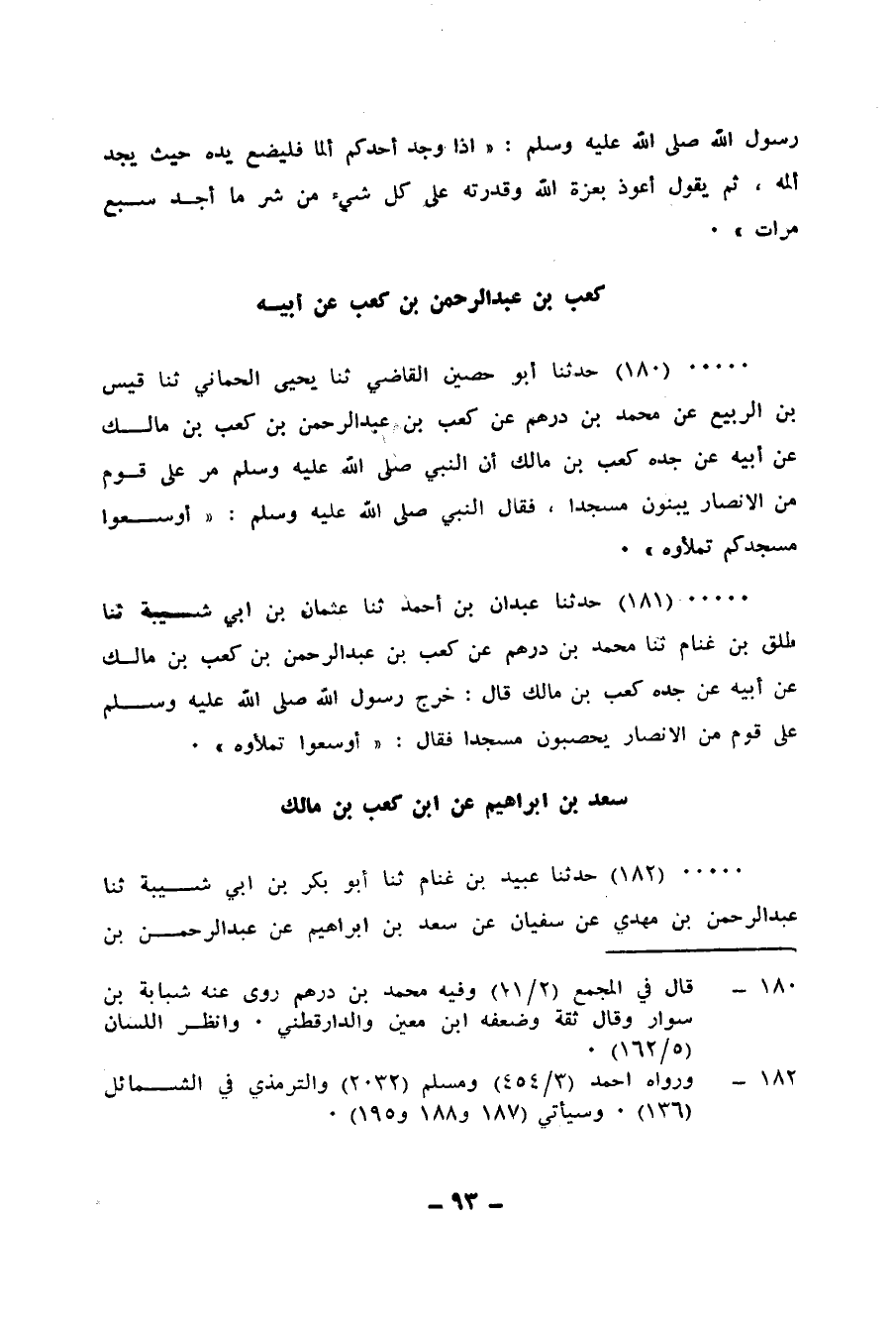 180 - حَدَّثَنَا أَبُو حُصَيْنٍ الْقَاضِي، ثنا يَحْيَى الْحِمَّانِيُّ، ثنا قَيْسُ بْنُ الرَّبِيعِ، عَنْ مُحَمَّدِ بْنِ دِرْهَمٍ، عَنْ كَعْبِ بْنِ عَبْدِ الرَّحْمَنِ بْنِ كَعْبِ بْنِ مَالِكٍ، عَنْ أَبِيهِ، عَنْ جَدِّهِ كَعْبِ بْنِ مَالِكٍ، أَنَّ النَّبِيَّ صَلَّى اللهُ عَلَيْهِ وَسَلَّمَ مَرَّ عَلَى قَوْمٍ مِنَ الْأَنْصَارِ يَبْنُونَ مَسْجِدًا، فَقَالَ النَّبِيُّ صَلَّى اللهُ عَلَيْهِ وَسَلَّمَ: «§أَوْسِعُوا مَسْجِدَكُمْ تَمْلَأُوهُ»