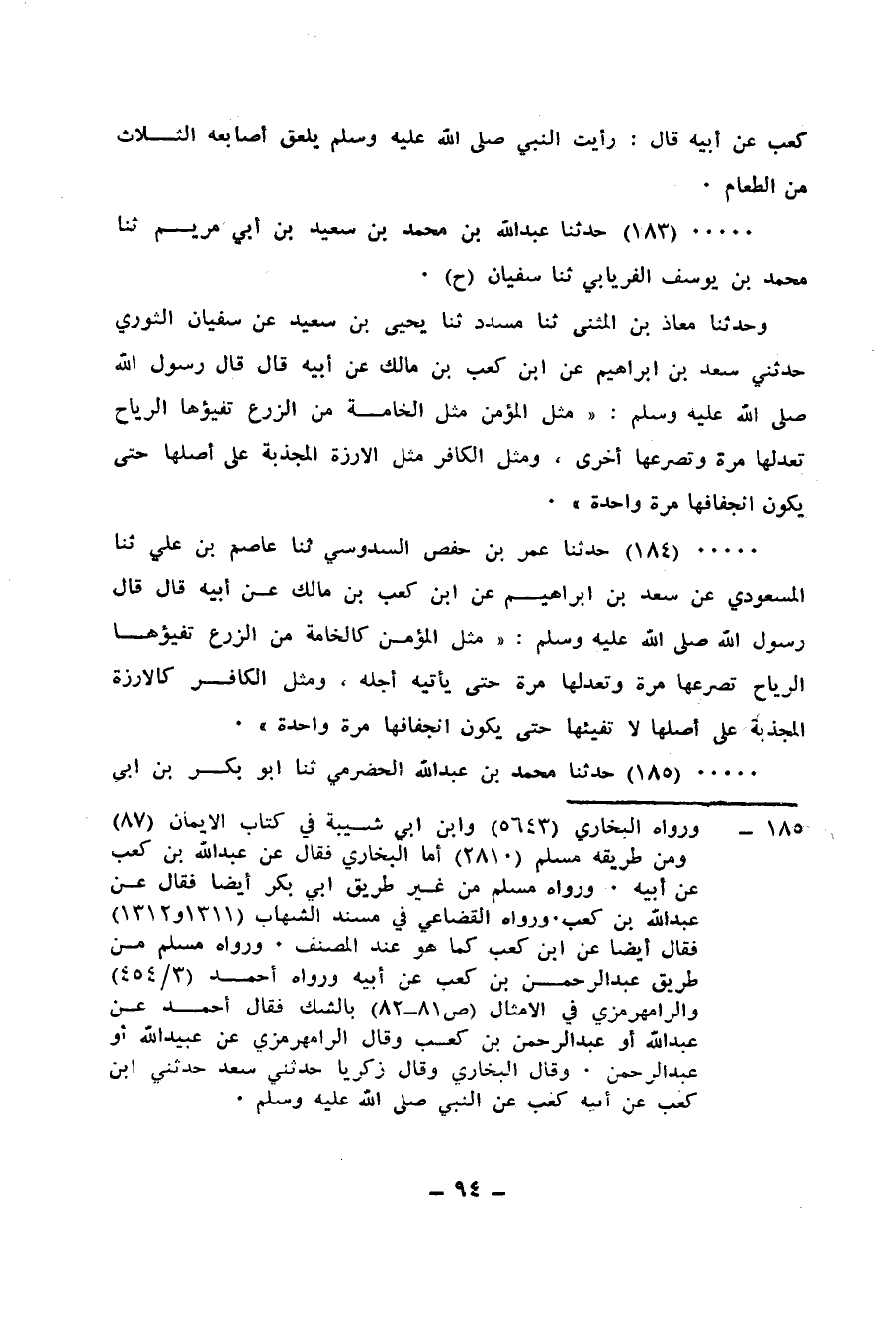 183 - حَدَّثَنَا عَبْدُ اللهِ بْنُ مُحَمَّدِ بْنِ سَعِيدِ بْنِ أَبِي مَرْيَمَ، ثنا مُحَمَّدُ بْنُ يُوسُفَ الْفِرْيَابِيُّ، ثنا سُفْيَانُ، ح وَحَدَّثَنَا مُعَاذُ بْنُ الْمُثَنَّى، ثنا مُسَدَّدٌ، ثنا يَحْيَى بْنُ سَعِيدٍ، عَنْ سُفْيَانَ الثَّوْرِيِّ، حَدَّثَنِي سَعْدُ بْنُ إِبْرَاهِيمَ، عَنِ ابْنِ كَعْبِ بْنِ مَالِكٍ، عَنْ أَبِيهِ، قَالَ: قَالَ رَسُولُ اللهِ صَلَّى اللهُ عَلَيْهِ وَسَلَّمَ: «§مَثَلُ الْمُؤْمِنِ مِثْلُ الْخَامَةِ مِنَ الزَّرْعِ تُفَيِّئُهَا الرِّيَاحُ تَعْدِلُهَا مَرَّةً وَتَصْرَعُهَا أُخْرَى، وَمَثَلُ الْكَافِرِ مِثْلَ الْأَرْزَةِ الْمُجْذِبَةِ عَلَى أَصْلِهَا حَتَّى يَكُونَ انْجِفَافُهَا مَرَّةً وَاحِدَةً»