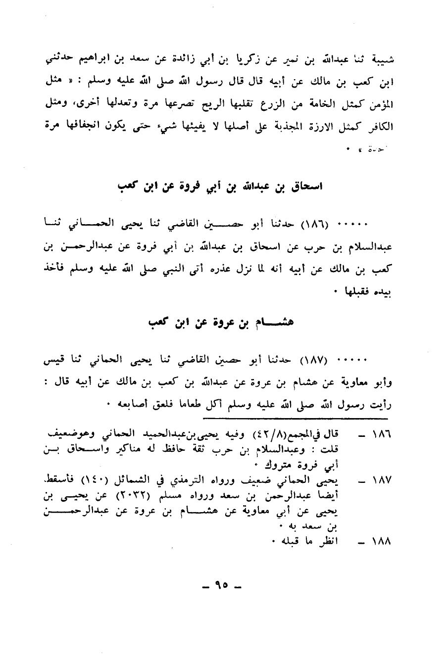186 - حَدَّثَنَا أَبُو حُصَيْنٍ الْقَاضِي، ثنا يَحْيَى الْحِمَّانِيُّ، ثنا عَبْدُ السَّلَامِ بْنُ حَرْبٍ، عَنْ إِسْحَاقَ بْنِ عَبْدِ اللهِ بْنِ أَبِي فَرْوَةَ، عَنْ عَبْدِ الرَّحْمَنِ بْنِ كَعْبِ بْنِ مَالِكٍ، عَنْ أَبِيهِ، أَنَّهُ لَمَّا «§نَزَلَ عُذْرُهُ أَتَى النَّبِيَّ صَلَّى اللهُ عَلَيْهِ وَسَلَّمَ فَأَخَذَ بِيَدِهِ فَقَبَّلَهَا»