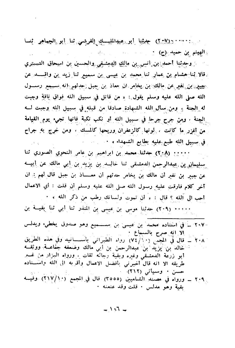 207 - حَدَّثَنَا أَبُو عَبْدِ الْمَلِكِ الْقُرَشِيُّ، ثنا أَبُو الْجَمَاهِرِ، ثنا الْهَيْثَمُ بْنُ حُمَيْدٍ، ح وَحَدَّثَنَا أَحْمَدُ بْنُ أَنَسِ بْنِ مَالِكٍ الدِّمَشْقِيُّ، وَالْحُسَيْنُ بْنُ إِسْحَاقَ التُّسْتَرِيُّ، قَالَا: ثنا هِشَامُ بْنُ عَمَّارٍ، ثنا مُحَمَّدُ بْنُ عِيسَى بْنِ سُمَيْعٍ، ثنا زَيْدُ بْنُ وَاقِدٍ، عَنْ جُبَيْرِ بْنِ نُفَيْرٍ، عَنْ مَالِكِ بْنِ يُخَامِرَ، أَنَّ مُعَاذَ بْنَ جَبَلٍ حَدَّثَهُمْ، أَنَّهُ سَمِعَ رَسُولَ اللهِ صَلَّى اللهُ عَلَيْهِ وَسَلَّمَ يَقُولُ: «§مَنْ قَاتَلَ فِي سَبِيلِ اللهِ فُوَاقَ نَاقَةٍ وَجَبَتْ لَهُ الْجَنَّةُ، وَمَنْ سَأَلَ اللهَ الشَّهَادَةَ صَادِقًا مِنْ قَلْبِهِ فِي سَبِيلِ اللهِ وَجَبَتْ لَهُ الْجَنَّةُ، وَمَنْ جُرِحَ جُرْحًا فِي سَبِيلِ اللهِ أَوْ نُكِبَ نَكْبَةً، فَإِنَّهَا تَجِيءُ يَوْمَ الْقِيَامَةِ مِنْ أَغْزَرِ مَا كَانَتْ، لَوْنُهَا كَالزَّعْفَرَانِ وَرِيحُهَا كَالْمِسْكِ، وَمَنْ خَرَجَ بِهِ جِرَاحٌ فِي سَبِيلِ اللهِ طُبِعَ عَلَيْهِ بِطَابَعِ الشُّهَدَاءِ»