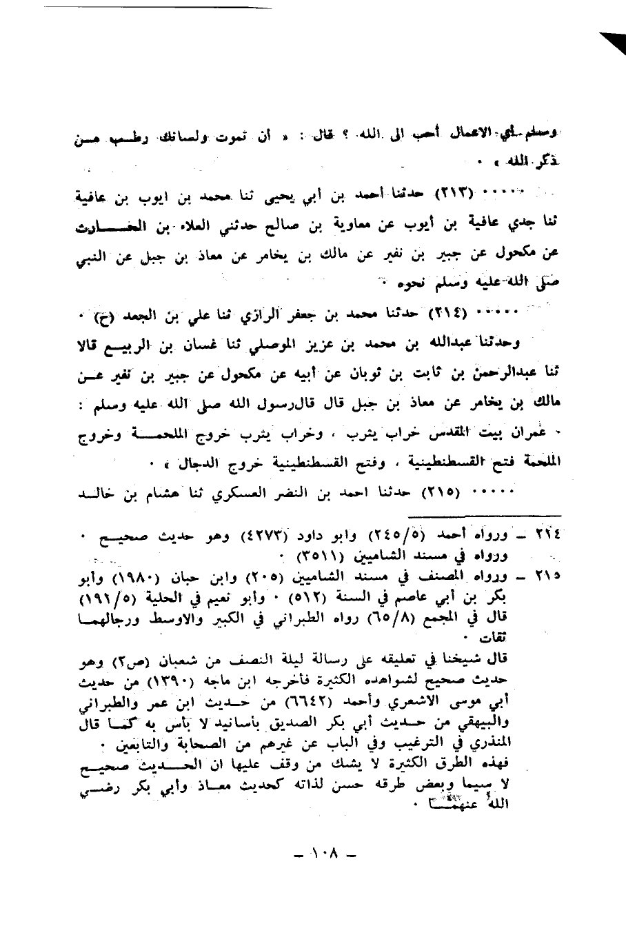 214 - حَدَّثَنَا مُحَمَّدُ بْنُ جَعْفَرٍ الرَّازِيُّ، ثنا عَلِيُّ بْنُ الْجَعْدِ، ح وَحَدَّثَنَا عَبْدُ اللهِ بْنُ مُحَمَّدِ بْنِ عَزِيزٍ الْمَوْصِلِيُّ، ثنا غَسَّانُ بْنُ الرَّبِيعِ قَالَا: ثنا عَبْدُ الرَّحْمَنِ بْنُ ثَابِتِ بْنِ ثَوْبَانَ، عَنْ أَبِيهِ، عَنْ مَكْحُولٍ، عَنْ جُبَيْرِ بْنِ نُفَيْرٍ، عَنْ مَالِكِ بْنِ يُخَامِرَ، عَنْ مُعَاذِ بْنِ جَبَلٍ، قَالَ: قَالَ رَسُولُ اللهِ صَلَّى اللهُ عَلَيْهِ وَسَلَّمَ: «§عُمْرَانُ بَيْتِ الْمَقْدِسِ خَرَابُ يَثْرِبَ، وَخَرَابُ يَثْرِبَ خُرُوجُ الْمَلْحَمَةِ، وَخُرُوجُ الْمَلْحَمَةِ فَتْحُ الْقُسْطَنْطِينِيَّةِ، وَفَتْحُ الْقُسْطَنْطِينِيَّةَ خُرُوجُ الدَّجَّالِ»