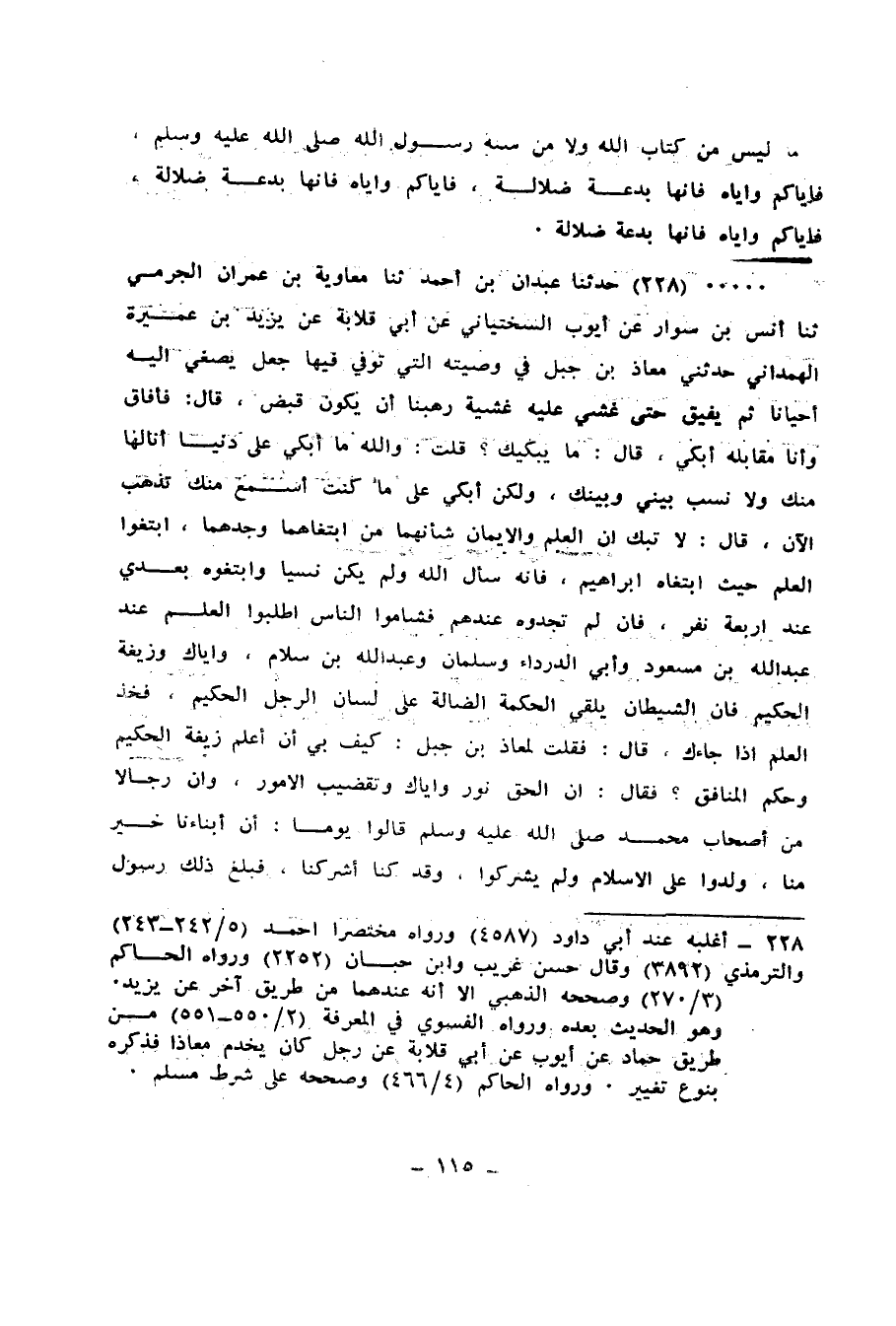 228 - حَدَّثَنَا عَبْدَانُ بْنُ أَحْمَدَ، ثنا مُعَاوِيَةُ بْنُ عِمْرَانَ الْجَرْمِيُّ، ثنا أَنَسُ بْنُ سَوَّارٍ، عَنْ أَيُّوبَ السَّخْتِيَانِيِّ، عَنْ أَبِي قِلَابَةَ، عَنْ يَزِيدَ بْنِ عَمِيرَةَ الْهَمَذَانِيِّ، حَدَّثَنِي مُعَاذُ بْنُ جَبَلٍ فِي وَصِيَّتِهِ الَّتِي تُوُفِّيَ فِيهَا، جَعَلَ يُصْغِي إِلَيْهِ أَحْيَانًا، ثُمَّ يُفِيقُ حَتَّى غُشِيَ عَلَيْهِ غشية رَهَبْنَا أَنْ يَكُونَ قُبِضَ، قَالَ: فَأَفَاقَ وَأَنَا مُقَابِلَهُ أَبْكِي، قَالَ: مَا يُبْكِيكَ؟ قُلْتُ: وَاللهِ مَا أَبْكِي عَلَى دُنْيَا أَنَالُهَا مِنْكَ، وَلَا نَسَبٍ بَيْنِي وَبَيْنَكَ، وَلَكِنْ أَبْكِي عَلَى مَا كُنْتُ أَسْمَعُ مِنْكَ تذْهَبُ الْآنَ، قَالَ: لَا تَبْكِ، إِنَّ الْعِلْمَ وَالْإِيمَانَ شَأْنُهُمَا: مَنِ ابْتَغَاهُمَا وَجَدَهُمَا، ابْتَغُوا الْعِلْمَ حَيْثُ ابْتَغَاهُ إِبْرَاهِيمُ، فَإِنَّهُ سَأَلَ اللهَ وَلَمْ يَكُنْ نَسِيًّا، وابْتَغُوهُ بَعْدِي عِنْدَ أَرْبَعَةِ نَفَرٍ، فَإِنْ لَمْ تَجِدُوهُ عِنْدَهُمْ فَشَامُّوا النَّاسَ، اطْلُبُوا الْعِلْمَ عِنْدَ عَبْدِ اللهِ بْنِ مَسْعُودٍ، وَأَبِي الدَّرْدَاءِ، وَسَلْمَانَ، وَعَبْدِ اللهِ بْنِ سَلَامٍ، وَإِيَّاكَ وَزَيْغَةَ الْحَكِيمِ، فَإِنَّ الشَّيْطَانَ يُلْقِي الْحِكْمَةَ الضَّالَّةَ عَلَى لِسَانِ الرَّجُلِ الْحَكِيمِ، فَخُذِ الْعِلْمَ إِذَا جَاءَكَ، قَالَ: فَقُلْتُ: لِمُعَاذِ بْنِ جَبَلٍ: كَيْفَ بِي أَنْ أَعْلَمَ زَيْغَةَ الْحَكِيمِ، وَحُكْمَ الْمُنَافِقِ؟ فَقَالَ إِنَّ الْحَقَّ نُورٌ، وَإِيَّاكَ وَتَقْضِيبَ الْأُمُورِ، وَإِنَّ رِجَالًا مِنْ أَصْحَابِ مُحَمَّدٍ صَلَّى اللهُ عَلَيْهِ وَسَلَّمَ قَالُوا يَوْمًا: إِنَّ أَبْنَاءَنَا خَيْرٌ مِنَّا، وُلِدُوا عَلَى الْإِسْلَامِ وَلَمْ يُشْرِكُوا، وَقَدْ كُنَّا أَشْرَكْنَا، فَبَلَغَ ذَلِكَ رَسُولَ اللهِ صَلَّى اللهُ عَلَيْهِ وَسَلَّمَ فَقَالَ: «§نَحْنُ خَيْرٌ مِنْ أَبْنَائِنَا، وَبَنُونَا خَيْرٌ مِنْ أَبْنَائِهِمْ، وَأَبْنَاءُ بَنِينَا خَيْرٌ مِنْ أَبْنَاءِ أَبْنَائِهِمْ»