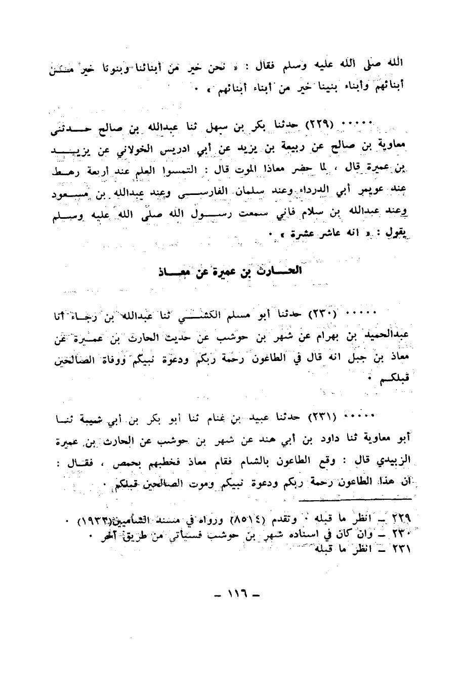 231 - حَدَّثَنَا عُبَيْدُ بْنُ غَنَّامٍ، ثنا أَبُو بَكْرِ بْنُ أَبِي شَيْبَةَ، ثنا أَبُو مُعَاوِيَةَ، ثنا دَاوُدُ بْنُ أَبِي هِنْدٍ، عَنْ شَهْرِ بْنِ حَوْشَبٍ، عَنِ الْحَارِثِ بْنِ عَمِيرَةَ الزُّبَيْدِيِّ قَالَ: وَقَعَ الطَّاعُونُ بِالشَّامِ، فَقَامَ مُعَاذٌ فَخَطَبَهُمْ بِحِمْصَ فَقَالَ: «إِنَّ هَذَا §الطَّاعُونَ رَحْمَةُ رَبِّكُمْ، وَدَعْوَةُ نَبِيِّكُمْ، وَمَوْتُ الصَّالِحِينَ قَبْلَكُمْ»