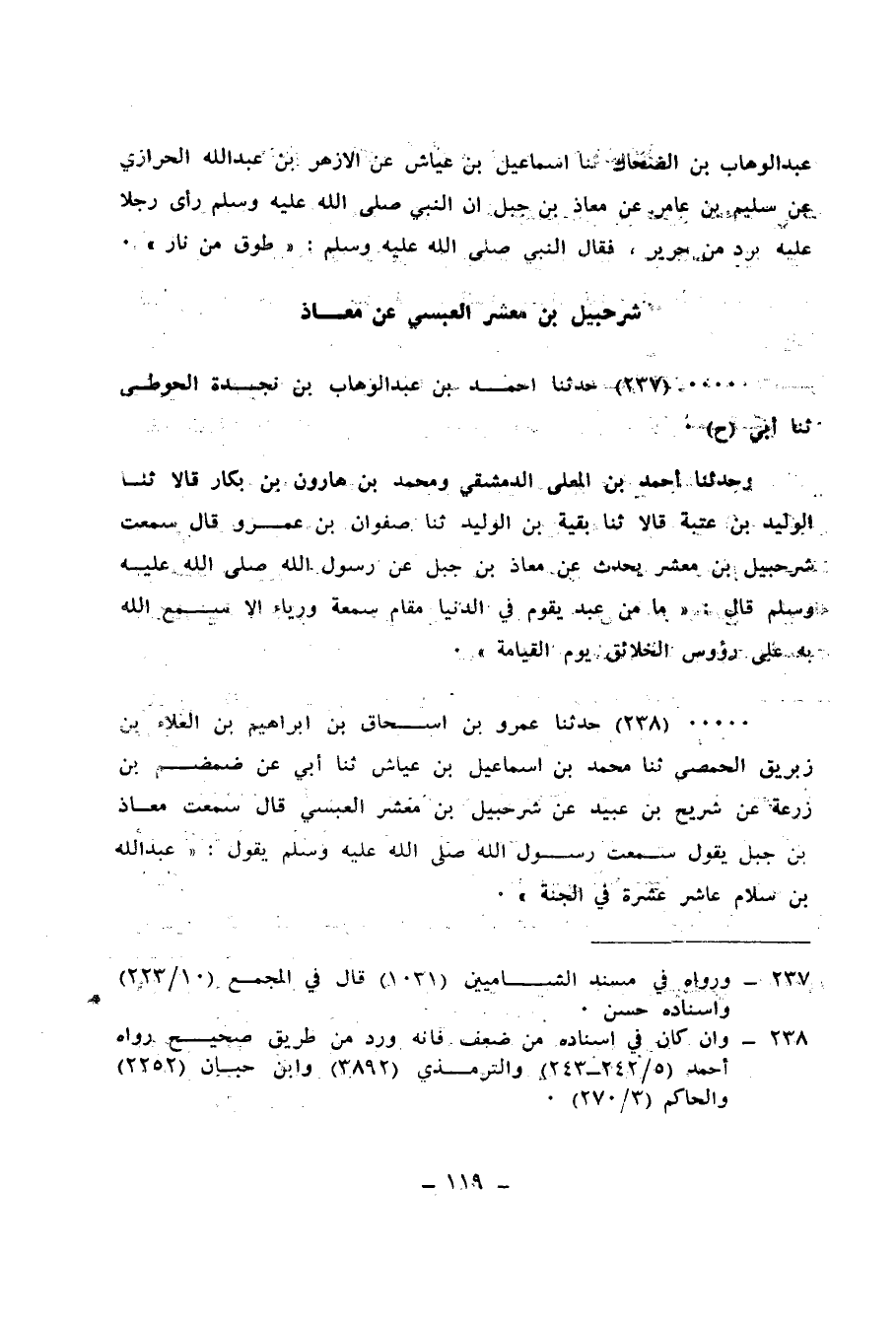 238 - حَدَّثَنَا عَمْرُو بْنُ إِسْحَاقَ بْنِ إِبْرَاهِيمَ بْنِ الْعَلَاءِ بْنِ زِبْرِيقٍ الْحِمْصِيُّ، ثنا مُحَمَّدُ بْنُ إِسْمَاعِيلَ بْنِ عَيَّاشٍ، ثنا أَبِي، عَنْ ضَمْضَمِ بْنِ زُرْعَةَ، عَنْ شُرَيْحِ بْنِ عُبَيْدٍ، عَنْ شُرَحْبِيلَ بْنِ مَعْشَرٍ الْعَبْسِيِّ، قَالَ: سَمِعْتُ مُعَاذَ بْنَ جَبَلٍ، يَقُولُ: سَمِعْتُ رَسُولَ اللهِ صَلَّى اللهُ عَلَيْهِ وَسَلَّمَ يَقُولُ: «§عَبْدُ اللهِ بْنُ سَلَامٍ عَاشِرُ عَشَرَةٍ فِي الْجَنَّةِ»
