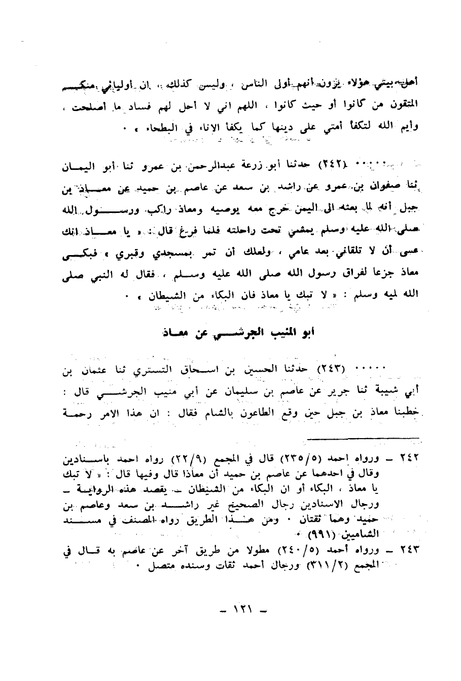 242 - حَدَّثَنَا أَبُو زُرْعَةَ عَبْدُ الرَّحْمَنِ بْنُ عَمْرٍو، ثنا أَبُو الْيَمَانِ، ثنا صَفْوَانُ بْنُ عَمْرٍو، عَنْ رَاشِدِ بْنِ سَعْدٍ، عَنْ عَاصِمِ بْنِ حُمَيْدٍ، عَنْ مُعَاذِ بْنِ جَبَلٍ، أَنَّهُ لَمَّا بَعَثَهُ إِلَى الْيَمَنِ خَرَجَ مَعَهُ يُوصِيهِ، وَمُعَاذٌ رَاكِبٌ، وَرَسُولُ اللهِ صَلَّى اللهُ عَلَيْهِ وَسَلَّمَ يَمْشِي تَحْتَ رَاحِلَتِهِ، فَلَمَّا فَرَغَ قَالَ: «يَا مُعَاذُ، إِنَّكَ §عَسَى أَنْ لَا تَلْقَانِي بَعْدَ عَامِي، وَلَعَلَّكَ أَنَّ تَمُرَّ بِمَسْجِدِي وَقَبْرِي» ، فَبَكَى مُعَاذُ بْنُ جَبَلٍ جَزَعًا لِفِرَاقِ رَسُولِ اللهِ صَلَّى اللهُ عَلَيْهِ وَسَلَّمَ، فَقَالَ لَهُ النَّبِيُّ صَلَّى اللهُ عَلَيْهِ وَسَلَّمَ: «لَا تَبْكِ يَا مُعَاذُ، فَإِنَّ الْبُكَاءَ مِنَ الشَّيْطَانِ»