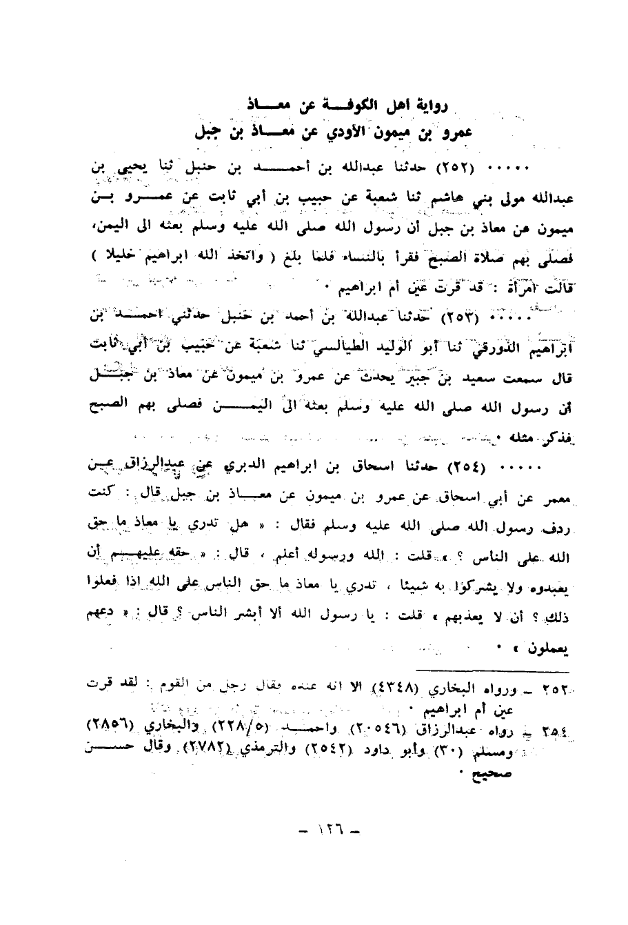 252 - حَدَّثَنَا عَبْدُ اللهِ بْنُ أَحْمَدَ بْنِ حَنْبَلٍ، ثنا يَحْيَى بْنُ عَبْدِ اللهِ، مَوْلَى بَنِي هَاشِمٍ، ثنا شُعْبَةُ، عَنْ حَبِيبِ بْنِ أَبِي ثَابِتٍ، عَنْ عَمْرِو بْنِ مَيْمُونٍ، عَنْ مُعَاذِ بْنِ جَبَلٍ، «أَنَّ رَسُولَ اللهِ صَلَّى اللهُ عَلَيْهِ وَسَلَّمَ §بَعَثَهُ إِلَى الْيَمَنِ» ، فَصَلَّى بِهِمْ صَلَاةَ الصُّبْحِ فَقَرَأَ بِالنِّسَاءِ، فَلَمَّا بَلَغَ: {وَاتَّخَذَ اللهُ إِبْرَاهِيمَ خَلِيلًا} [النساء: 125] " قَالَتِ امْرَأَةٌ: قَدْ قَرَّتْ عَيْنُ أُمِّ إِبْرَاهِيمَ