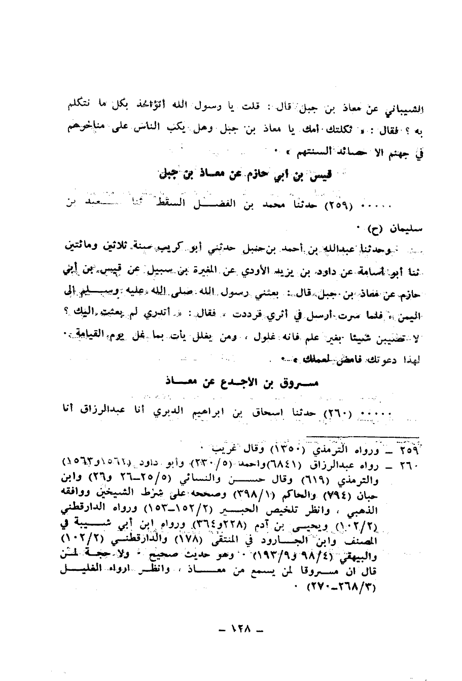 259 - حَدَّثَنَا مُحَمَّدُ بْنُ الْفَضْلِ السَّقَطِيُّ، ثنا سَعِيدُ بْنُ سُلَيْمَانَ، ح وَحَدَّثَنَا عَبْدُ اللهِ بْنُ أَحْمَدَ بْنِ حَنْبَلٍ، حَدَّثَنِي أَبُو كُرَيْبٍ، سَنَةَ ثَلَاثِينَ وَمِائَتَيْنِ، ثنا أَبُو أُسَامَةَ، عَنْ دَاوُدَ بْنِ يَزِيدَ الْأَوْدِيِّ، عَنِ الْمُغِيرَةِ بْنِ سَبِيلٍ، عَنْ قَيْسِ بْنِ أَبِي حَازِمٍ، عَنْ مُعَاذِ بْنِ جَبَلٍ قَالَ: بَعَثَنِي رَسُولُ اللهِ صَلَّى اللهُ عَلَيْهِ وَسَلَّمَ إِلَى الْيَمَنِ، فَلَمَّا سِرْتُ أَرْسَلَ فِي أَثَرِي فَرَدَدْتُ، فَقَالَ: «أَتَدْرِي لِمَ بَعَثْتُ إِلَيْكَ؟ §لَا تُصِيبَنَّ شَيْئًا بِغَيْرِ عِلْمٍ، فَإِنَّهُ غُلُولٌ، وَمَنْ يَغْلُلْ يَأْتِ بِمَا غَلَّ يَوْمَ الْقِيَامَةِ، لِهَذَا دَعَوْتُكَ، فَامْضِ لِعَمَلِكَ»