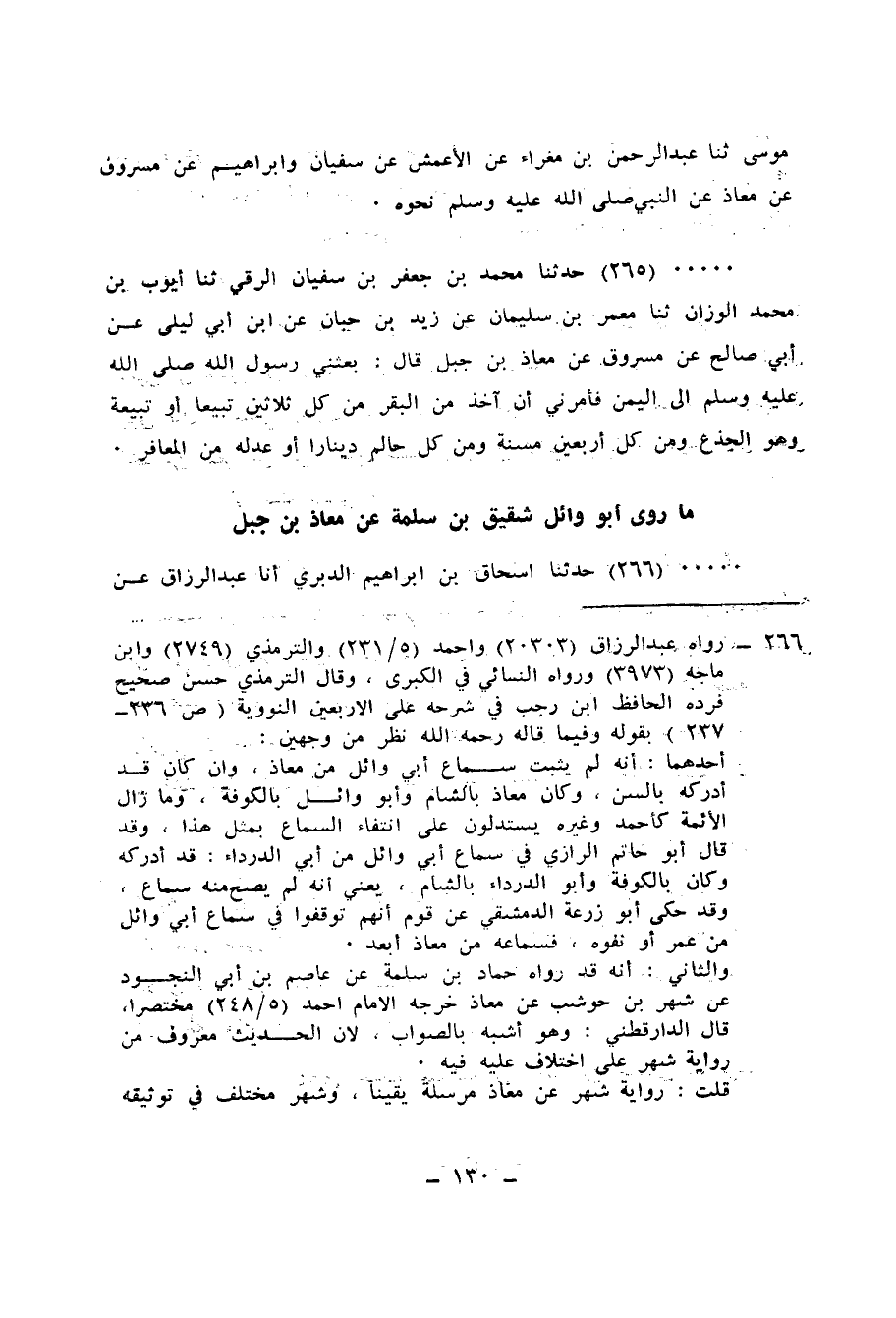 265 - حَدَّثَنَا مُحَمَّدُ بْنُ جَعْفَرِ بْنِ سُفْيَانَ الرَّقِّيُّ، ثنا أَيُّوبُ بْنُ مُحَمَّدٍ الْوَزَّانُ، ثنا مَعْمَرُ بْنُ سُلَيْمَانَ، عَنْ زَيْدِ بْنِ حِبَّانَ، عَنِ ابْنِ أَبِي لَيْلَى، عَنْ أَبِي صَالِحٍ، عَنْ مَسْرُوقٍ، عَنْ مُعَاذِ بْنِ جَبَلٍ، قَالَ: بَعَثَنِي رَسُولُ اللهِ صَلَّى اللهُ عَلَيْهِ وَسَلَّمَ إِلَى الْيَمَنِ، «§فَأَمَرَنِي أَنْ آخُذَ مِنَ الْبَقَرِ مِنْ كُلِّ ثَلَاثِينَ تَبِيعًا أَوْ تَبِيعَةً - وَهُوَ الْجَذَعُ - وَمِنْ كُلِّ أَرْبَعِينَ مُسِنَّةً، وَمِنْ كُلِّ حَالِمٍ دِينَارًا أَوْ عِدْلَهُ مِنَ الْمَعَافِرِ»
