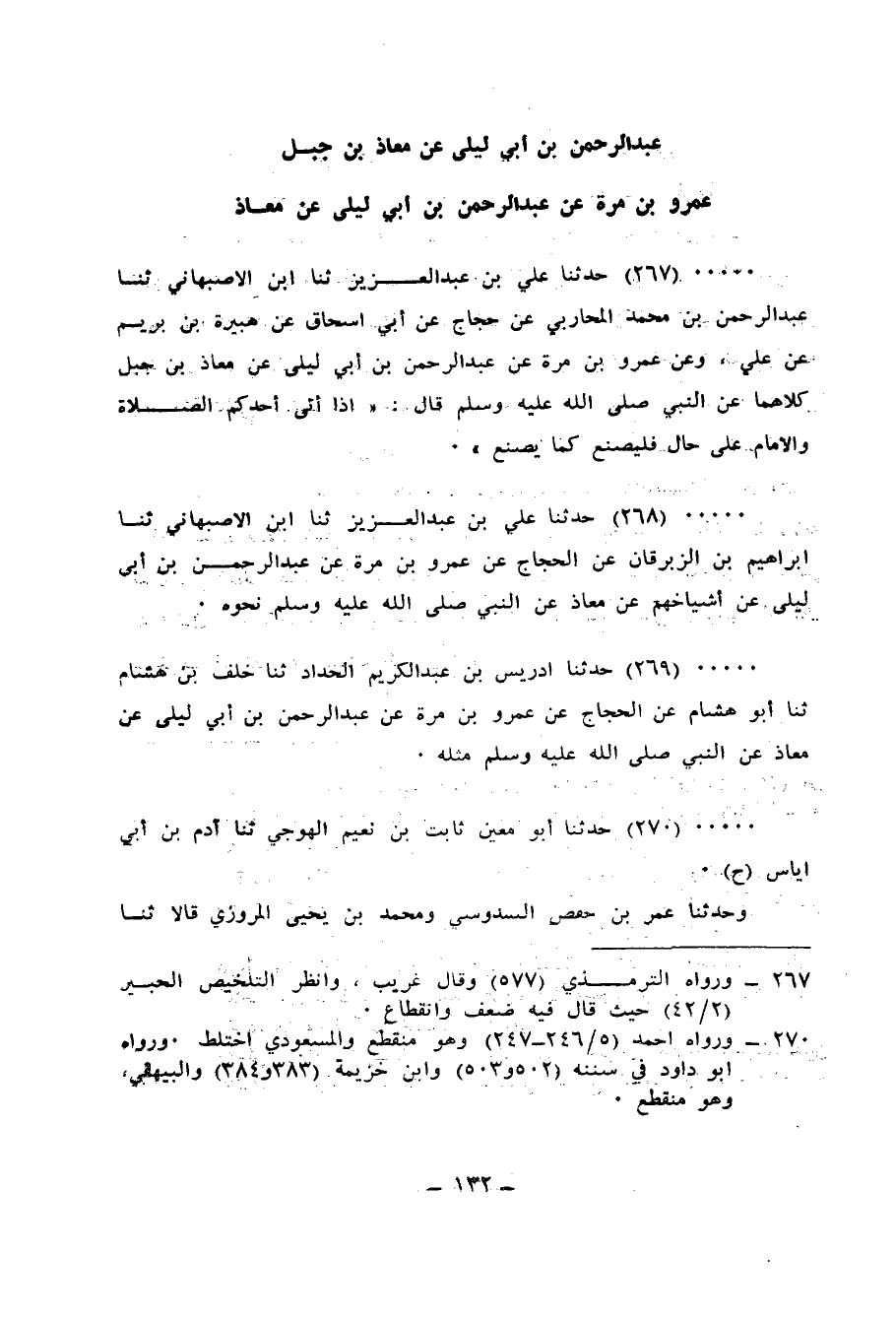 269 - حَدَّثَنَا إِدْرِيسُ بْنُ عَبْدِ الْكَرِيمِ الْحَدَّادُ، ثنا خَلْفُ بْنُ هِشَامٍ، ثنا أَبُو شِهَابٍ، عَنِ الْحَجَّاجِ، عَنْ عَمْرِو بْنِ مُرَّةَ، عَنْ عَبْدِ الرَّحْمَنِ بْنِ أَبِي لَيْلَى، عَنْ مُعَاذٍ، عَنِ النَّبِيِّ صَلَّى اللهُ عَلَيْهِ وَسَلَّمَ مِثْلَهُ