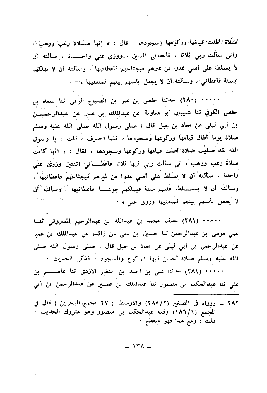 280 - حَدَّثَنَا حَفْصُ بْنُ عُمَرَ بْنِ الصَّبَّاحِ الرَّقِّيُّ، ثنا سَعْدُ بْنُ حَفْصٍ الْكُوفِيُّ، ثنا شَيْبَانُ أَبُو مُعَاوِيَةَ، عَنْ عَبْدِ الْمَلِكِ بْنِ عُمَيْرٍ، عَنْ عَبْدِ الرَّحْمَنِ بْنِ أَبِي لَيْلَى، عَنْ مُعَاذِ بْنِ جَبَلٍ، قَالَ: صَلَّى رَسُولُ اللهِ صَلَّى اللهُ عَلَيْهِ وَسَلَّمَ صَلَاةً يَوْمًا أَطَالَ قِيَامَهَا وَرُكُوعَهَا وَسُجُودَهَا، فَلَمَّا انْصَرَفَ قُلْتُ: يَا رَسُولَ اللهِ، لَقَدْ صَلَّيْتَ صَلَاةً أَطَلْتَ قِيَامَهَا وَرُكُوعَهَا وَسُجُودَهَا، فَقَالَ: «إِنَّهَا كَانَتْ صَلَاةَ رَغِبٍ وَرَهَبٍ، إِنِّي §سَأَلْتُ رَبِّي فِيهَا ثَلَاثًا فَأَعْطَانِيَ اثْنَتَيْنِ، وَزَوَى عَنِّي وَاحِدَةً، سَأَلْتُهُ أَنْ لَا يُسَلَّطَ عَلَى أُمَّتِي عَدُوًّا مِنْ غَيْرِهِمْ فَيَجْتَاحَهُمْ فَأَعْطَانِيهَا، وَسَأَلْتُهُ أَنْ لَا يُسَلَّطَ عَلَيْهِمْ سَنَةً فَيُهْلِكَهُمْ جُوعًا فَأَعْطَانِيهَا، وَسَأَلْتُهُ أَنْ لَا يَجْعَلَ بَأْسَهُمْ بَيْنَهُمْ فَمَنَعَنِيهَا وَزَوَى عَنِّي»