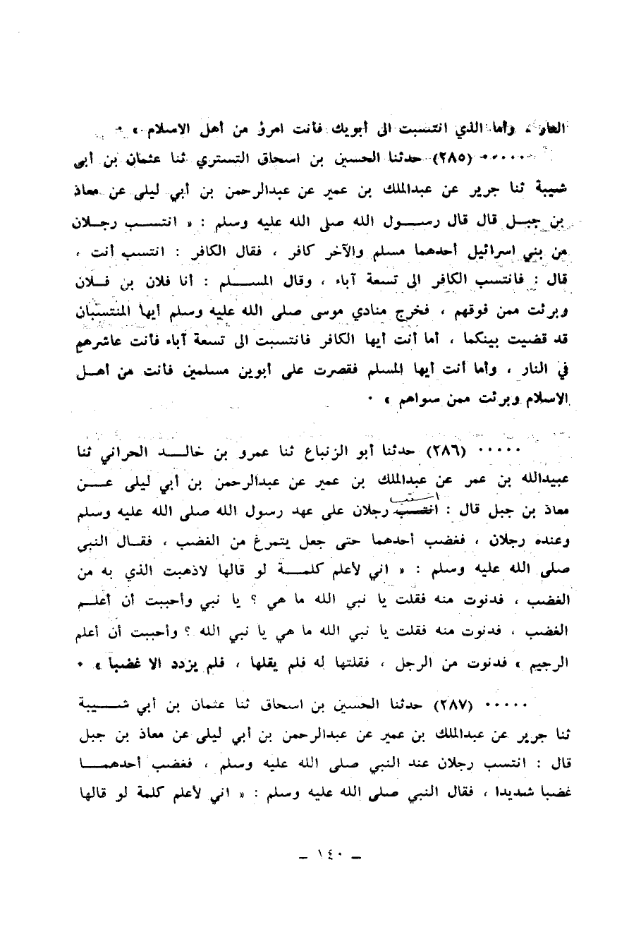 285 - حَدَّثَنَا الْحُسَيْنُ بْنُ إِسْحَاقَ التُّسْتَرِيُّ، ثنا عُثْمَانُ بْنُ أَبِي شَيْبَةَ، ثنا جَرِيرٌ، عَنْ عَبْدِ الْمَلِكِ بْنِ عُمَيْرٍ، عَنْ عَبْدِ الرَّحْمَنِ بْنِ أَبِي لَيْلَى، عَنْ مُعَاذِ بْنِ جَبَلٍ، قَالَ: قَالَ رَسُولُ اللهِ صَلَّى اللهُ عَلَيْهِ وَسَلَّمَ: " §انْتَسَبَ رَجُلَانِ مِنْ بَنِي إِسْرَائِيلَ أَحَدُهُمَا مُسْلِمٌ وَالْآخَرُ كَافِرٌ، فَقَالَ الْكَافِرُ: انْتَسِبْ أَنْتَ، قَالَ: فَانْتَسَبَ الْكَافِرُ إِلَى تِسْعَةِ آبَاءٍ، وَقَالَ الْمُسْلِمُ: أَنَا فُلَانُ بْنُ فُلَانٍ وَبَرِئْتُ مِمَّنْ فَوْقَهُمْ، فَخَرَجَ مُنَادِي مُوسَى صَلَّى اللهُ عَلَيْهِ وَسَلَّمَ أَيُّهَا الْمُنْتَسِبانِ قَدْ قَضَيْتُ بَيْنَكُمَا، أَمَّا أَنْتَ أَيُّهَا الْكَافِرُ فَانْتَسَبْتَ إِلَى تِسْعَةِ آبَاءٍ فَأَنْتَ عَاشِرُهُمْ فِي النَّارِ، وَأَمَّا أَنْتَ أَيُّهَا الْمُسْلِمُ فَقَصُرْتَ عَلَى أَبَوَيْنِ مُسْلِمَيْنِ فَأَنْتَ مِنْ أَهْلِ الْإِسْلَامِ وَبَرِئْتَ مِمَّنْ سِوَاهُمْ "