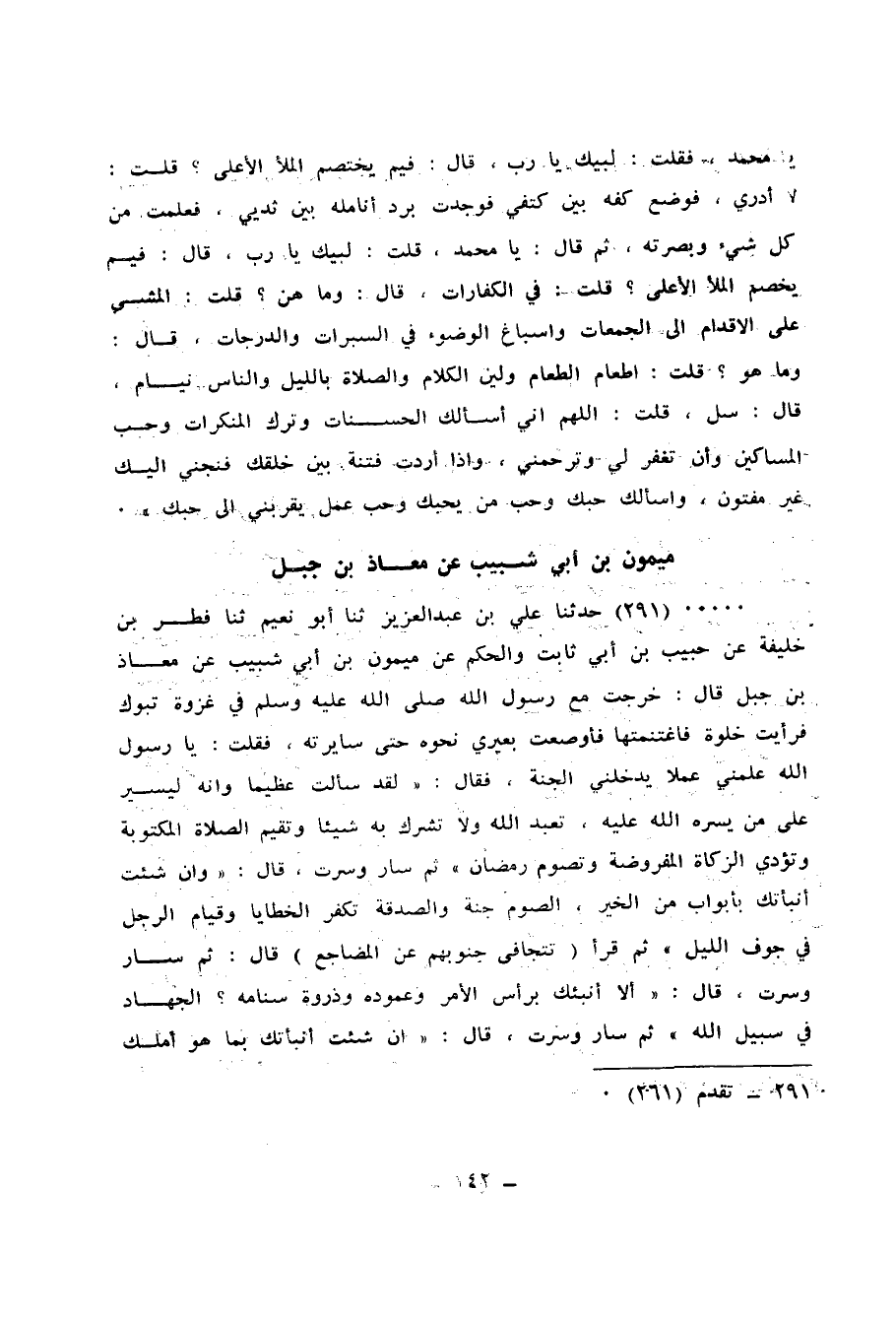 291 - حَدَّثَنَا عَلِيُّ بْنُ عَبْدِ الْعَزِيزِ، ثنا أَبُو نُعَيْمٍ، ثنا فِطْرُ بْنُ خَلِيفَةَ، عَنْ حَبِيبِ بْنِ أَبِي ثَابِتٍ، وَالْحَكَمِ، عَنْ مَيْمُونِ بْنِ أَبِي شَبِيبٍ، عَنْ مُعَاذِ بْنِ جَبَلٍ قَالَ: خَرَجْتُ مَعَ رَسُولِ اللهِ صَلَّى اللهُ عَلَيْهِ وَسَلَّمَ فِي غَزْوَةِ تَبُوكٍ، فَرَأَيْتُ خَلْوَةً فَاغْتَنَمْتُهَا، فَأَوْضَعْتُ بَعِيرِي نَحْوَهُ حَتَّى سَايَرْتُهُ، فَقُلْتُ: يَا رَسُولَ اللهِ عَلِّمْنِي عَمَلًا يُدْخِلُنِي الْجَنَّةَ، فَقَالَ: " لَقَدْ سَأَلْتَ عَظِيمًا، وَإِنَّهُ لَيَسِيرٌ عَلَى مَنْ يَسَّرَهُ اللهُ عَلَيْهِ: §تَعْبُدُ اللهَ وَلَا تُشْرِكُ بِهِ شَيْئًا، وَتُقِيمُ الصَّلَاةَ الْمَكْتُوبَةَ، وَتُؤَدِّي الزَّكَاةَ الْمَفْرُوضَةَ، وَتَصُومُ رَمَضَانَ "، ثُمَّ سَارَ وَسِرْتُ