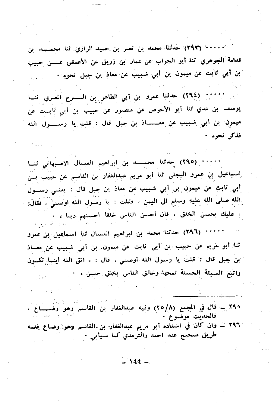 295 - حَدَّثَنَا مُحَمَّدُ بْنُ إِبْرَاهِيمَ الْعَسَّالِ الْأَصْبَهَانِيُّ، ثنا إِسْمَاعِيلُ بْنُ عَمْرٍو الْبَجَلِيُّ، ثنا أَبُو مَرْيَمَ عَبْدُ الْغَفَّارِ بْنُ الْقَاسِمِ، عَنْ حَبِيبِ بْنِ أَبِي ثَابِتٍ، عَنْ مَيْمُونِ بْنِ أَبِي شَبِيبٍ، عَنْ مُعَاذِ بْنِ جَبَلٍ قَالَ: بَعَثَنِي رَسُولُ اللهِ صَلَّى اللهُ عَلَيْهِ وَسَلَّمَ إِلَى الْيَمَنِ، فَقُلْتُ: يَا رَسُولَ اللهِ أَوْصِنِي، فَقَالَ: «§عَلَيْكَ بِحُسْنِ الْخُلُقِ، فَإِنَّ أَحْسَنَ النَّاسِ خُلُقًا أَحْسَنُهُمْ دِينًا»