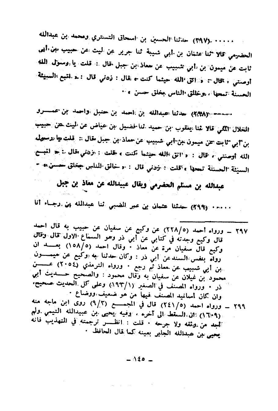 298 - حَدَّثَنَا عَبْدُ اللهِ بْنُ أَحْمَدَ بْنِ حَنْبَلٍ، وَأَحْمَدُ بْنُ عَمْرٍو الْخَلَّالُ الْمَكِّيُّ، قَالَا: ثنا يَعْقُوبُ بْنُ حُمَيْدٍ، ثنا فُضَيْلُ بْنُ عِيَاضٍ، عَنْ لَيْثٍ، عَنْ حَبِيبِ بْنِ أَبِي ثَابِتٍ، عَنْ مَيْمُونِ بْنِ أَبِي شَبِيبٍ، عَنْ مُعَاذِ بْنِ جَبَلٍ، قَالَ: قُلْتُ: يَا رَسُولَ اللهِ، أَوْصِنِي، قَالَ: «§اتَّقِ اللهَ حَيْثُمَا كُنْتَ» قُلْتُ: زِدْنِي قَالَ: «أَتْبِعِ السَّيِّئَةَ الْحَسَنَةَ تَمْحُهَا» قُلْتُ: زِدْنِي، قَالَ: «خَالِقِ النَّاسَ بِخُلُقٍ حَسَنٍ»