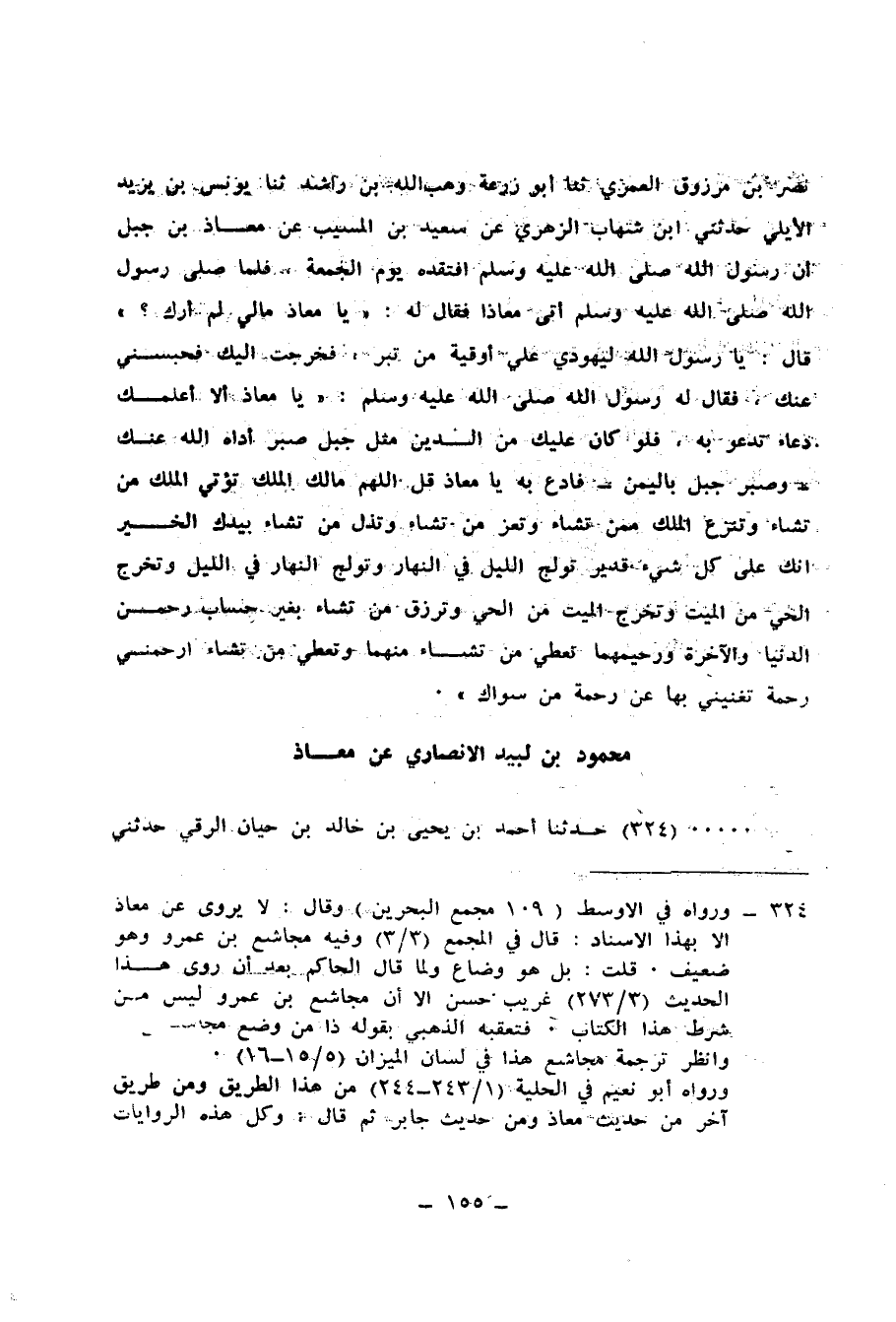 324 - حَدَّثَنَا أَحْمَدُ بْنُ يَحْيَى بْنِ خَالِدِ بْنِ حَيَّانَ الرَّقِّيُّ، حَدَّثَنِي عَمْرُو بْنُ بَكْرِ بْنِ بَكَّارٍ الْقَعْنَبِيُّ، ثنا مُجَاشِعُ بْنُ عَمْرِو بْنِ حَسَّانٍ الْأَسَدِيُّ، ثنا اللَّيْثُ بْنُ سَعْدٍ، عَنْ عَاصِمِ بْنِ عُمَرَ بْنِ قَتَادَةَ، عَنْ مَحْمُودِ بْنِ لَبِيدٍ، عَنْ مُعَاذِ بْنِ جَبَلٍ، أَنَّهُ مَاتَ ابْنٌ لَهُ فَكَتَبَ إِلَيْهِ رَسُولُ اللهِ صَلَّى اللهُ عَلَيْهِ وَسَلَّمَ يُعَزِّيهِ بِابْنِهِ فَكَتَبَ إِلَيْهِ: " بِسْمِ اللهِ الرَّحْمَنِ الرَّحِيمِ، مِنْ مُحَمَّدٍ رَسُولِ اللهِ صَلَّى اللهُ عَلَيْهِ وَسَلَّمَ إِلَى مُعَاذِ بْنِ جَبَلٍ، سَلَامٌ عَلَيْكَ، فَإِنِّي أَحْمَدُ إِلَيْكَ اللهَ الَّذِي لَا إِلَهَ إِلَّا هُوَ. أَمَّا بَعْدُ، §فَأَعْظَمَ اللهُ لَكَ الْأَجْرَ، وأَلْهَمَكَ الصَّبْرَ، وَرَزَقَنَا وَإِيَّاكَ الشُّكْرَ، فَإِنَّ أَنْفُسَنَا وَأَمْوَالَنَا وَأَهْلِينا مِنْ مَوَاهِبِ اللهِ الْهَنِيئةِ وَعَوَارِيهِ الْمُسْتَوْدَعَةِ، يُمَتِّعُ بِهَا إِلَى أَجْلٍ، ويَقْبِضُهَا إِلَى وَقْتٍ مَعْلُومٍ، وَإِنَّا نَسْأَلُهُ الشُّكْرَ عَلَى مَا أَعْطَى، وَالصَّبْرَ إِذَا ابْتَلَى، وَكَانَ ابْنُكَ مِنْ مَوَاهِبِ اللهِ الْهَنِيئةِ وَعَوَارِيهِ الْمُسْتَوْدَعَةِ، مَتَّعكَ اللهُ بِهِ فِي غِبْطَةٍ وَسُرُورٍ، وَقَبَضَهُ مِنْكَ بِأَجْرٍ كَثِيرٍ: الصَّلَاةِ وَالرَّحْمَةِ وَالْهُدَى إِنِ احْتَسَبَتْهُ، فَاصْبِرْ، وَلَا يُحْبِطْ جَزَعُكَ أَجْرَكَ فَتَنْدمَ، وَاعْلَمْ أَنَّ الْجَزَعَ لَا يَرُدُّ مَيِّتًا، وَلَا يَدْفَعَ حُزْنًا، وَمَا هُوَ نَازِلٌ فَكَأَنْ قَدْ وَالسَّلَامُ "