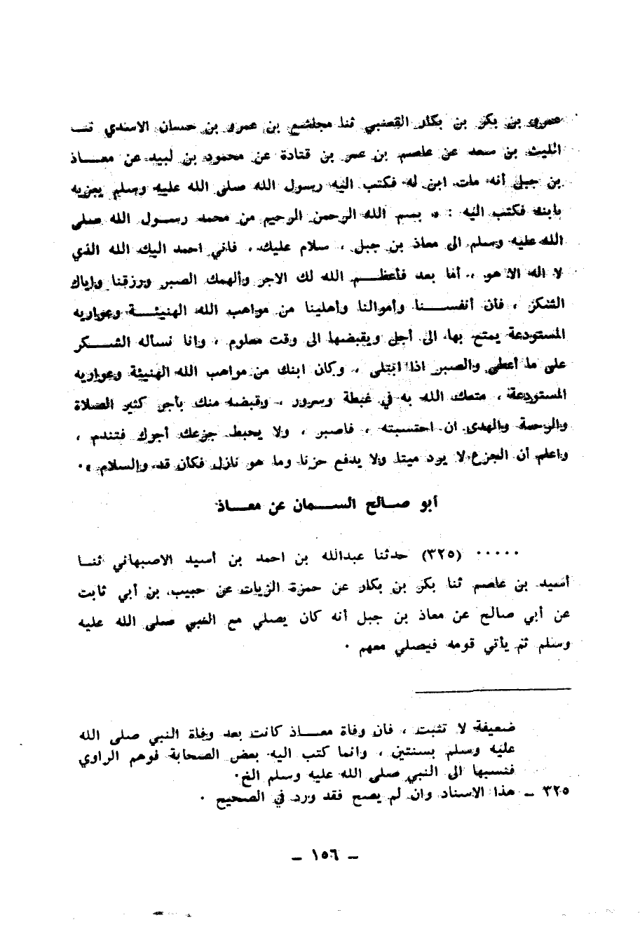 325 - حَدَّثَنَا عَبْدُ اللهِ بْنُ أَحْمَدَ بْنِ أُسَيْدٍ الْأَصْبَهَانِيُّ، ثنا أُسَيْدُ بْنُ عَاصِمٍ، ثنا بَكْرُ بْنُ بَكَّارٍ، عَنْ حَمْزَةَ الزَّيَّاتِ، عَنْ حَبِيبِ بْنِ أَبِي ثَابِتٍ، عَنْ أَبِي صَالِحٍ، عَنْ مُعَاذِ بْنِ جَبَلٍ، أَنَّهُ «كَانَ §يُصَلِّي مَعَ النَّبِيِّ صَلَّى اللهُ عَلَيْهِ وَسَلَّمَ، ثُمَّ يَأْتِي قَوْمَهُ فَيُصَلِّي مَعَهُمْ»