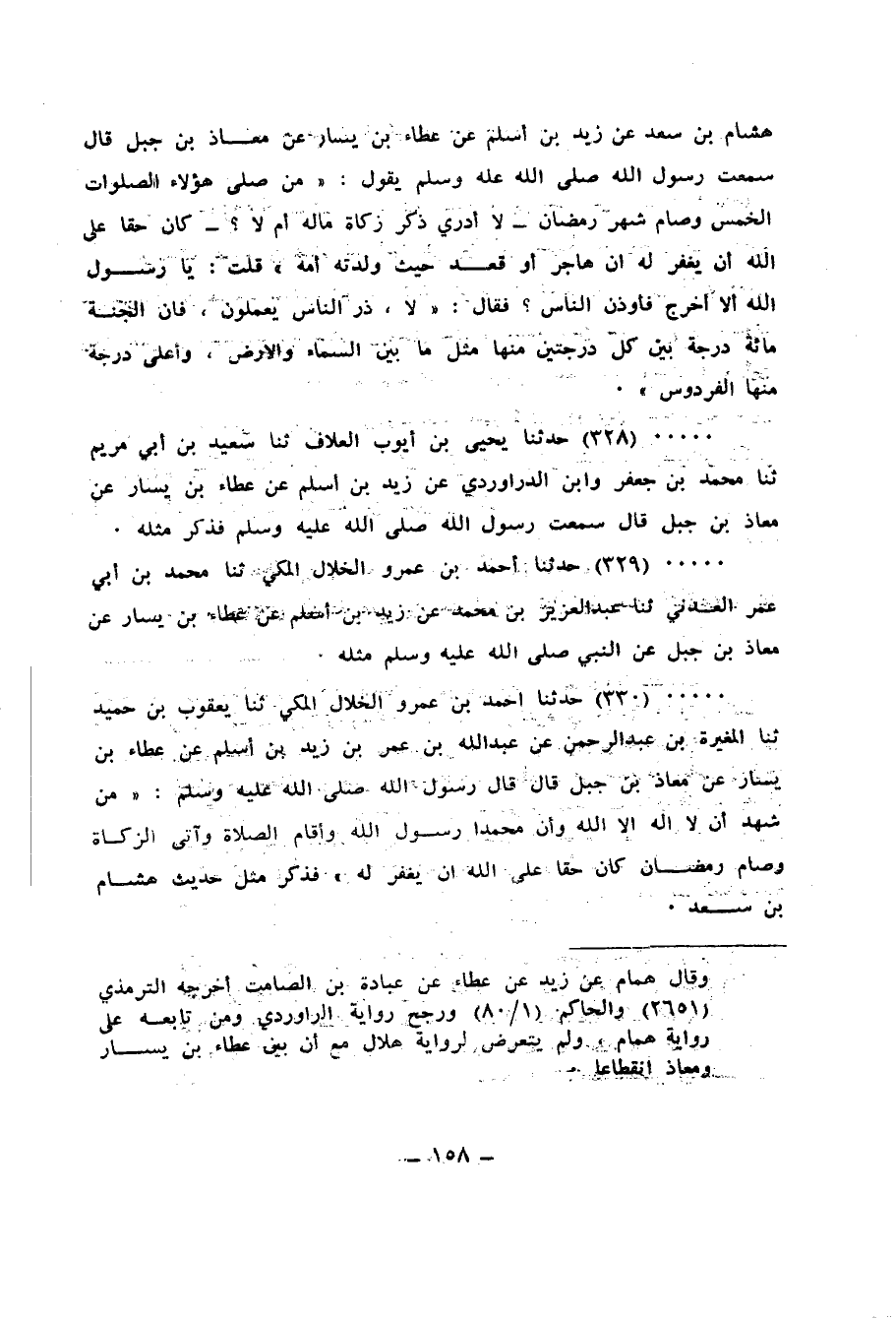 330 - حَدَّثَنَا أَحْمَدُ بْنُ عَمْرٍو الْخَلَّالُ الْمَكِّيُّ، ثنا يَعْقُوبُ بْنُ حُمَيْدٍ، ثنا الْمُغِيرَةُ بْنُ عَبْدِ الرَّحْمَنِ، عَنْ عَبْدِ اللهِ بْنِ عُمَرَ بْنِ زَيْدِ بْنِ أَسْلَمَ، عَنْ عَطَاءِ بْنِ يَسَارٍ، عَنْ مُعَاذِ بْنِ جَبَلٍ قَالَ: قَالَ رَسُولُ اللهِ صَلَّى اللهُ عَلَيْهِ وَسَلَّمَ: «§مَنْ شَهِدَ أَنْ لَا إِلَهَ إِلَّا اللهُ، وَأَنَّ مُحَمَّدًا رَسُولُ اللهِ، وَأَقَامَ الصَّلَاةَ، وَآتَى الزَّكَاةَ، وَصَامَ رَمَضَانَ كَانَ حَقًّا عَلَى اللهِ أَنْ يَغْفِرَ لَهُ» فَذَكَرَ مِثْلَ حَدِيثِ هِشَامِ بْنِ سَعْدٍ