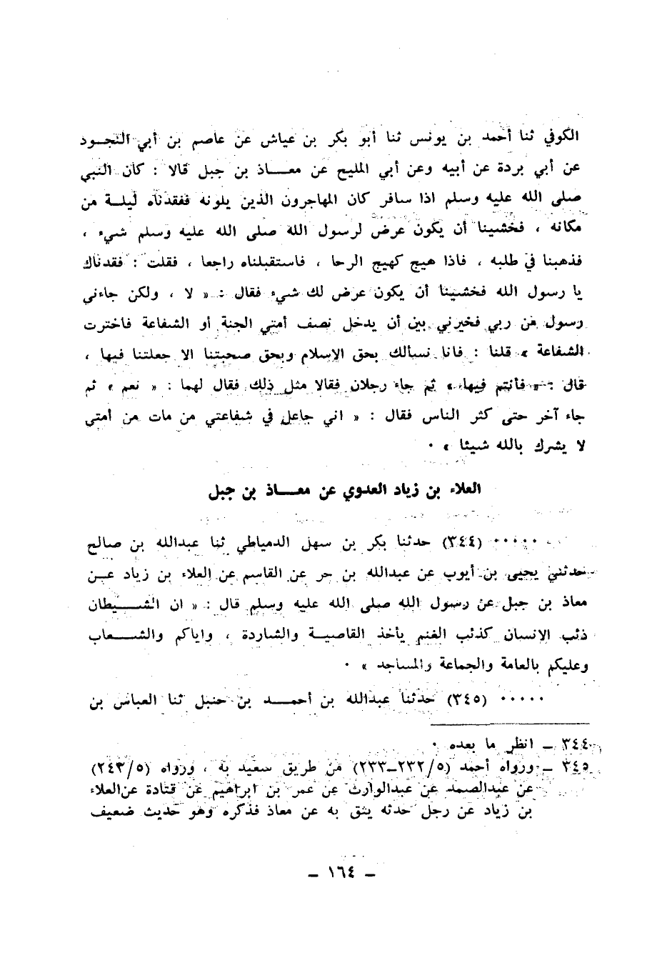 345 - حَدَّثَنَا عَبْدُ اللهِ بْنُ أَحْمَدَ بْنِ حَنْبَلٍ، ثنا الْعَبَّاسُ بْنُ الْوَلِيدِ النَّرْسِيُّ، ثنا يَزِيدُ بْنُ زُرَيْعٍ، ثنا سَعِيدُ بْنُ أَبِي عَرُوبَةَ، عَنْ قَتَادَةَ، عَنِ الْعَلَاءِ بْنِ زِيَادٍ، عَنْ مُعَاذِ بْنِ جَبَلٍ، أَنَّ نَبِيَّ اللهِ صَلَّى اللهُ عَلَيْهِ وَسَلَّمَ كَانَ يَقُولُ: «§الشَّيْطَانُ ذِئْبُ الْإِنْسَانِ كَذِئْبِ الْغَنَمِ، يَأْخُذُ الشَّاةَ الشَّارِدَةَ، وَالْقَاصِيَةَ، وَالنَّاحِيَةَ»