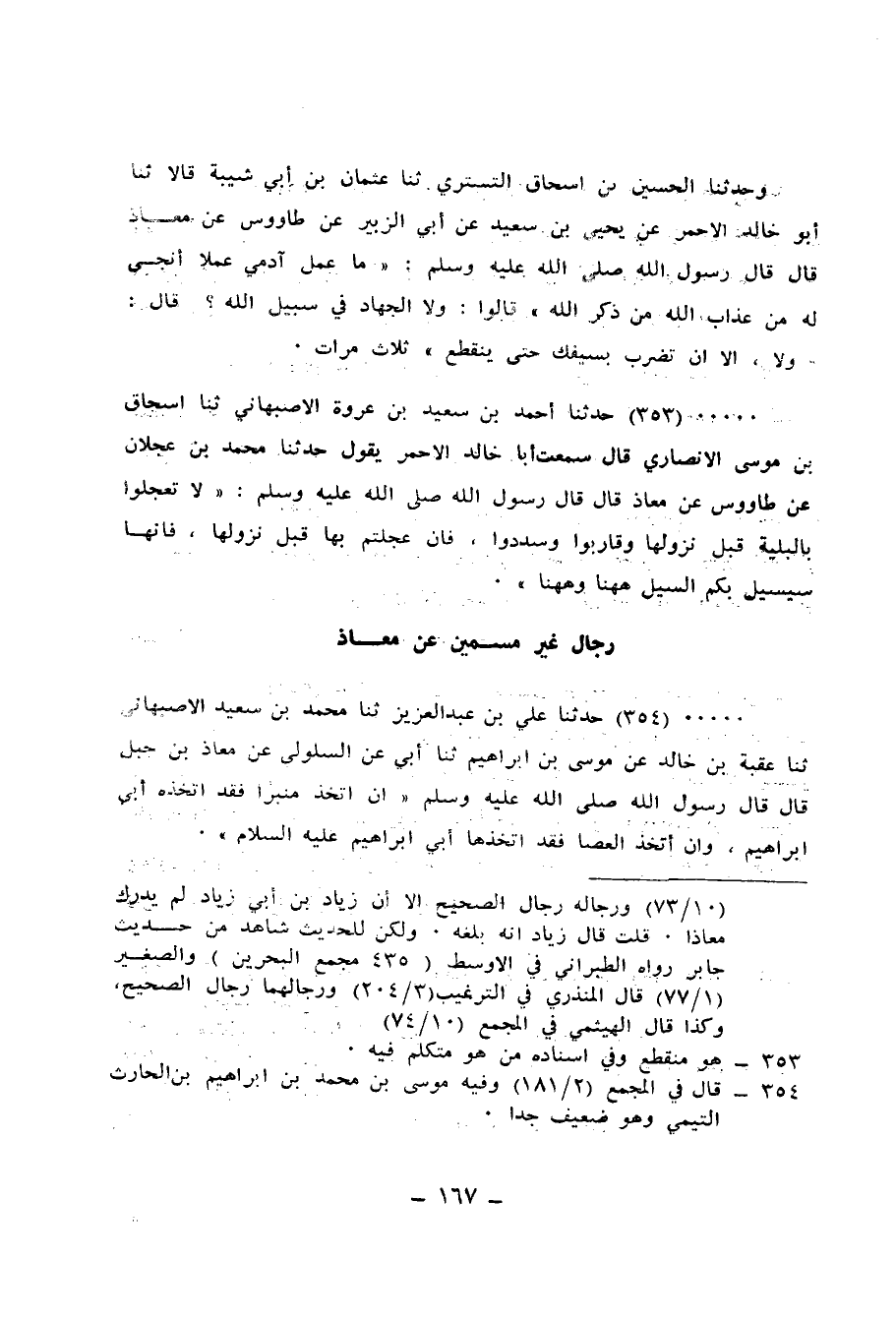 354 - حَدَّثَنَا عَلِيُّ بْنُ عَبْدِ الْعَزِيزِ، ثنا مُحَمَّدُ بْنُ سَعِيدٍ الْأَصْبَهَانِيُّ، ثنا عُقْبَةُ بْنُ خَالِدٍ، عَنْ مُوسَى بْنِ إِبْرَاهِيمَ، ثنا أَبِي، عَنِ السَّلُولِيِّ، عَنْ مُعَاذِ بْنِ جَبَلٍ، قَالَ: قَالَ رَسُولُ اللهِ صَلَّى اللهُ عَلَيْهِ وَسَلَّمَ: «§إِنْ أَتَّخِذْ مِنْبَرًا فَقَدِ اتَّخَذَهُ أَبِي إِبْرَاهِيمُ، وَإِنْ أَتَّخِذِ الْعَصَا فَقَدِ اتَّخَذَهَا أَبِي إِبْرَاهِيمُ عَلَيْهِ السَّلَامُ»