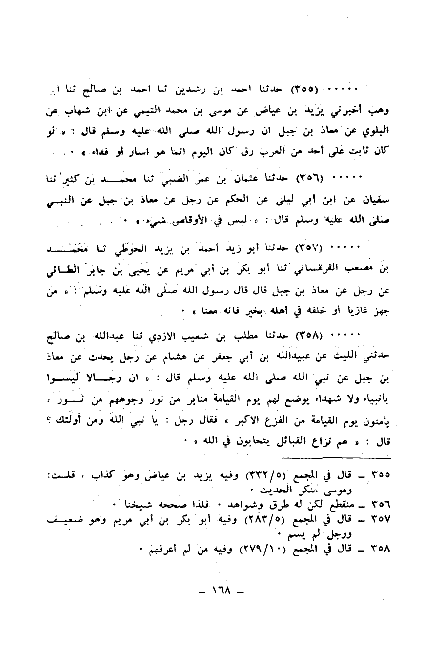 358 - حَدَّثَنَا مُطَّلِبُ بْنُ شُعَيْبٍ الْأَزْدِيُّ، ثنا عَبْدُ اللهِ بْنُ صَالِحٍ، حَدَّثَنِي اللَّيْثُ، عَنْ عَبْدِ اللهِ بْنِ أَبِي جَعْفَرٍ، عَنْ هِشَامٍ، عَنْ رَجُلٍ يُحَدِّثُ، عَنْ مُعَاذِ بْنِ جَبَلٍ، عَنْ نَبِيِّ اللهِ صَلَّى اللهُ عَلَيْهِ وَسَلَّمَ قَالَ: «§إِنَّ رِجَالًا لَيْسُوا بِأَنْبِيَاءَ وَلَا شُهَدَاءَ يُوضَعُ لَهُمْ يَوْمَ الْقِيَامَةِ مَنَابِرُ مِنْ نُورٍ، وُجُوهَهُمْ مِنْ نُورٍ، يَأْمَنُونَ يَوْمَ الْقِيَامَةِ مِنَ الْفَزَعِ الْأَكْبَرِ» فَقَالَ رَجُلٌ: يَا نَبِيَّ اللهِ، وَمَنْ أُولَئِكَ؟ قَالَ: «هُمْ نُزَّاعُ الْقَبَائِلِ، يَتَحَابُّونَ فِي اللهِ»