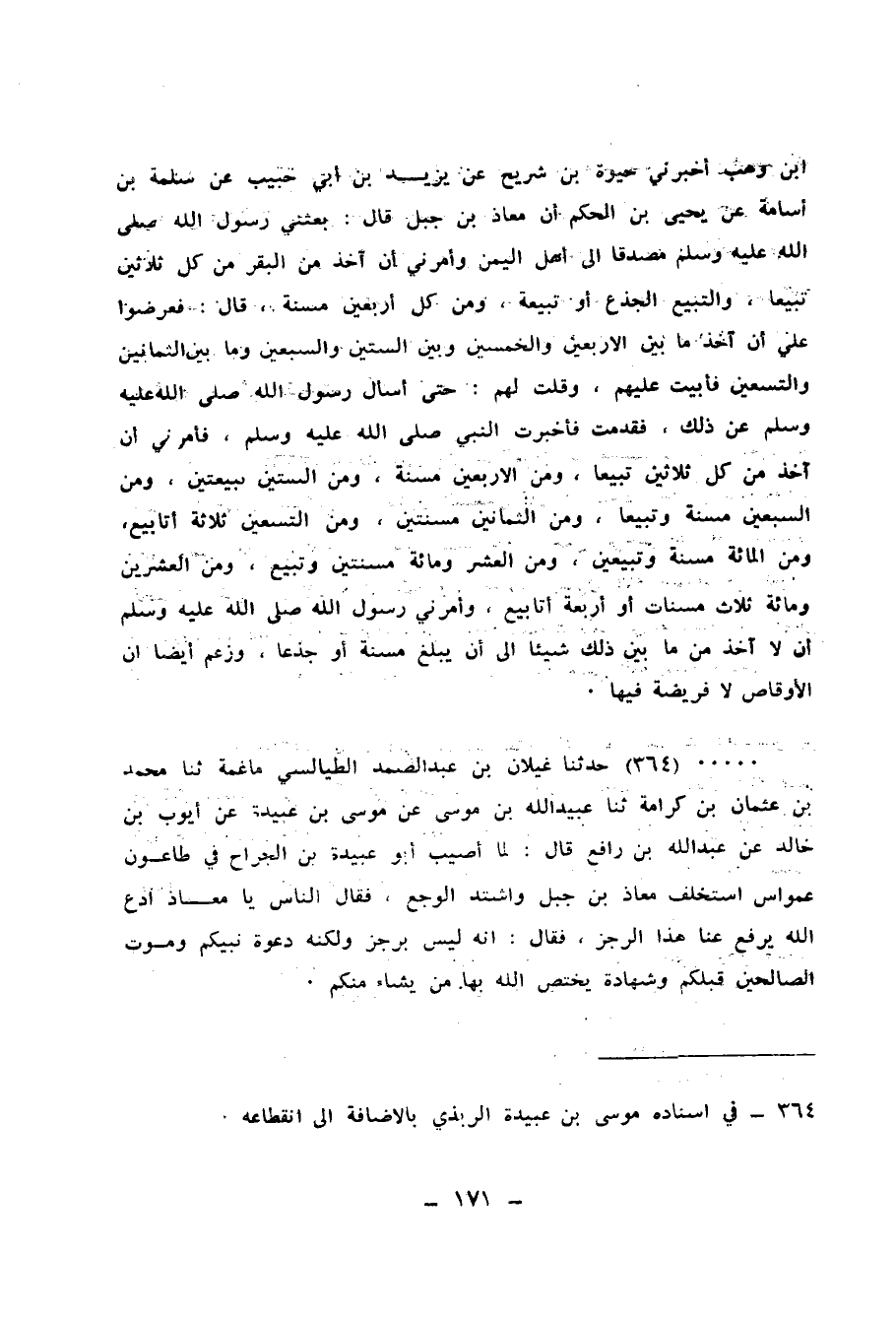 364 - حَدَّثَنَا غَيْلَانُ بْنُ عَبْدِ الصَّمَدِ الطَّيَالِسِيُّ مَاغِمَةُ، ثنا مُحَمَّدُ بْنُ عُثْمَانَ بْنِ كَرَامَةَ، ثنا عُبَيْدُ اللهِ بْنُ مُوسَى، عَنْ مُوسَى بْنِ عُبَيْدَةَ، عَنْ أَيُّوبَ بْنِ خَالِدٍ، عَنْ عَبْدِ اللهِ بْنِ رَافِعٍ قَالَ: لَمَّا أُصِيبَ أَبُو عُبَيْدَةَ بْنُ الْجَرَّاحِ فِي طَاعُونِ عَمَوَاسٍ اسْتَخْلَفَ مُعَاذَ بْنَ جَبَلٍ، وَاشْتَدَّ الْوَجَعُ فَقَالَ النَّاسُ: يَا مُعَاذُ، ادْعُ اللهَ يَرْفَعْ عَنَّا هَذَا الرِّجْزَ، فَقَالَ: «§إِنَّهُ لَيْسَ بِرِجْزٍ، وَلَكِنَّهُ دَعْوَةُ نَبِيِّكُمْ، وَمَوْتُ الصَّالِحِينَ قَبْلَكُمْ، وَشَهَادَةٌ يَخْتَصُّ اللهُ بِهَا مَنْ يَشَاءُ مِنْكُمْ»
