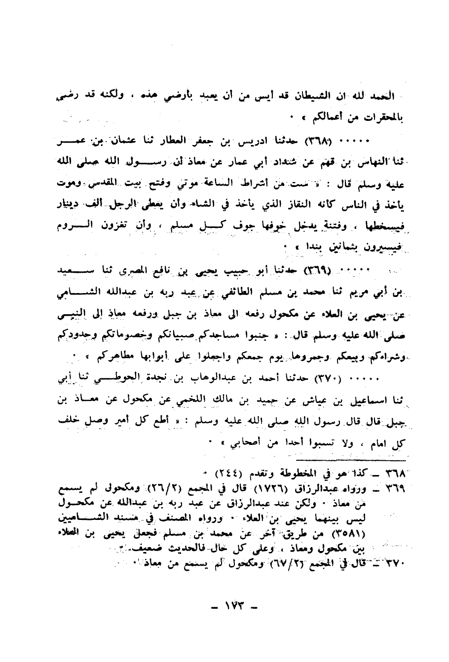368 - حَدَّثَنَا إِدْرِيسُ بْنُ جَعْفَرٍ الْعَطَّارُ، ثنا عُثْمَانُ بْنُ عُمَرَ، ثنا النَّهَّاسُ بْنُ قَهْمٍ، عَنْ شَدَّادٍ أَبِي عَمَّارٍ، عَنْ مُعَاذٍ، أَنَّ رَسُولَ اللهِ صَلَّى اللهُ عَلَيْهِ وَسَلَّمَ قَالَ: " §سِتٌّ مِنْ أَشْرَاطِ السَّاعَةِ: مَوْتَى، وَفَتْحُ بَيْتِ الْمَقْدِسِ، وَمَوْتٌ يَأْخُذُ فِي النَّاسِ كَأَنَّهُ النُّقازُ الَّذِي يَأْخُذُ فِي الشَّاءِ، وَأَنْ يُعْطَى الرَّجُلُ أَلْفَ دِينَارٍ فَيَسْخَطَهَا، وَفِتْنَةٌ يَدْخُلُ خَوْفُهَا جَوْفَ كُلِّ مُسْلِمٍ، وَأَنْ تَغْزُوَنَا الرُّومُ فَيَسِيرُوا بِثَمَانِينَ بَنْدًا "