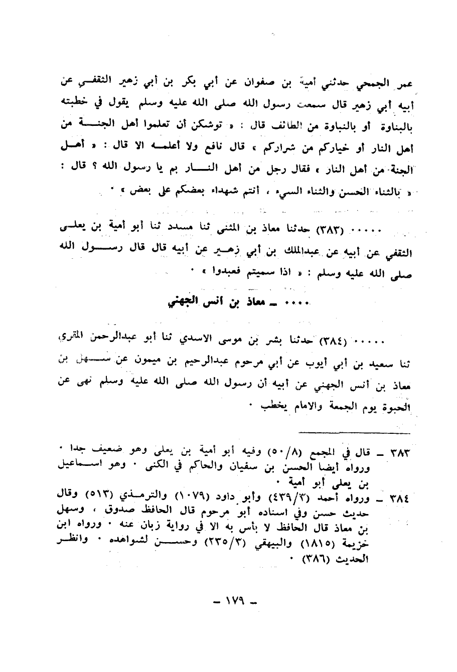 383 - حَدَّثَنَا مُعَاذُ بْنُ الْمُثَنَّى، ثنا مُسَدَّدٌ، ثنا أَبُو أُمَيَّةَ بْنُ يَعْلَى الثَّقَفِيُّ، عَنْ أَبِيهِ، عَنْ عَبْدِ الْمَلِكِ بْنِ أَبِي زُهَيْرٍ، عَنْ أَبِيهِ، قَالَ: قَالَ رَسُولُ اللهِ صَلَّى اللهُ عَلَيْهِ وَسَلَّمَ: «§إِذَا سَمَّيْتُمْ فَعَبِّدُوا»