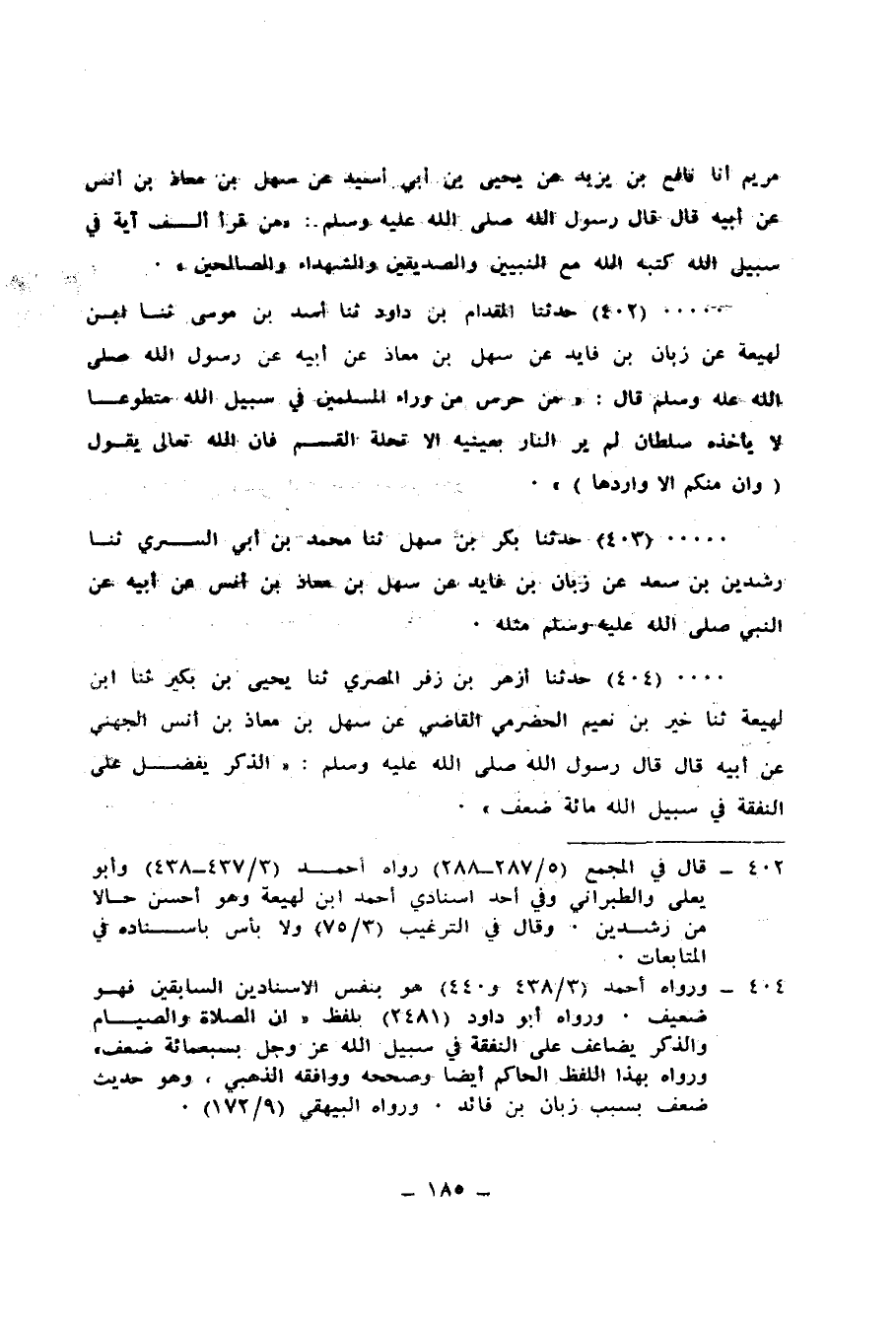 402 - حَدَّثَنَا الْمِقْدَامُ بْنُ دَاوُدَ، ثنا أَسَدُ بْنُ مُوسَى، ثنا ابْنُ لَهِيعَةَ، عَنْ زَبَّانَ بْنِ فَائِدٍ، عَنْ سَهْلِ بْنِ مُعَاذٍ، عَنْ أَبِيهِ، عَنْ رَسُولِ اللهِ صَلَّى اللهُ عَلَيْهِ وَسَلَّمَ قَالَ: " §مَنْ حَرَسَ مِنْ وَرَاءِ الْمُسْلِمِينَ فِي سَبِيلِ اللهِ مُتَطَوِّعًا لَا يَأْخُذُهُ سُلْطَانٌ لَمْ يَرَ النَّارَ بِعَيْنَيْهِ إِلَّا تَحِلَّةَ الْقَسَمِ، فَإِنَّ اللهَ تَعَالَى يَقُولُ: {وَإِنْ مِنْكُمْ إِلَّا وَارِدُهَا} [مريم: 71] "